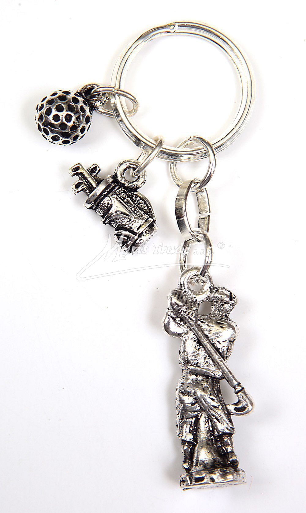 přívěsek na klíče ze stříbrného kovu s figurkou golfisty, golfovým bagem a míčkem