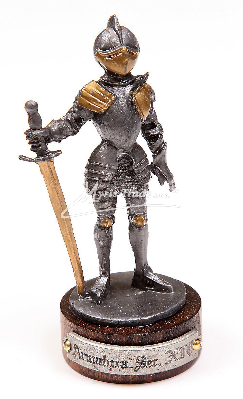 soška rytíře v brnění provedená z šedého a bronzového kovu, na dřevěném podstavci