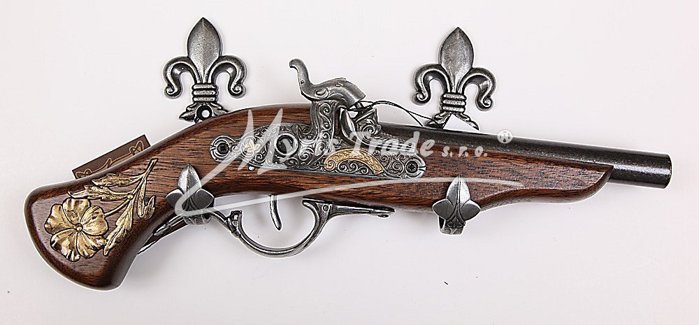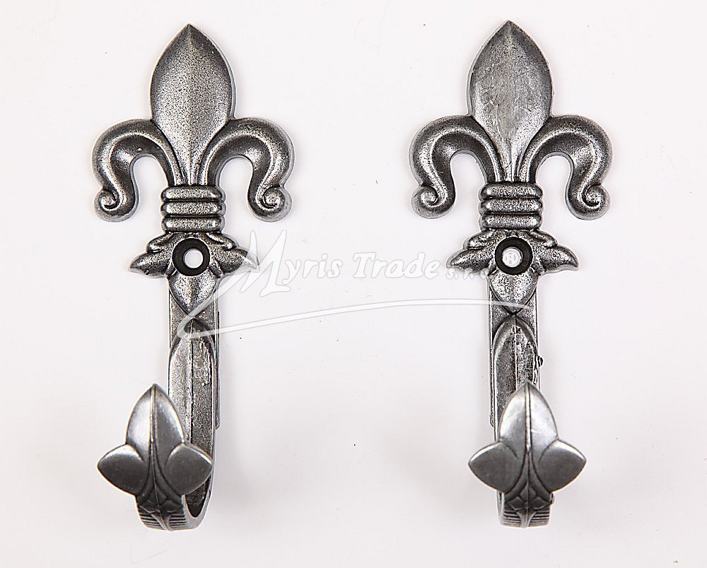 Sada dvou ozdobných háčků z šedého kovu. Jsou vhodné na upevnění replik pistolí.