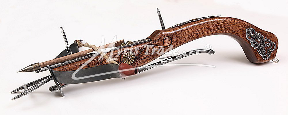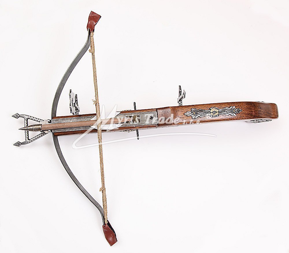 nefunkční replika historické kuše s dolním spouštěcím mechanizmem vyrobená ze dřeva a šedého kovu s dřevěnou šipkou