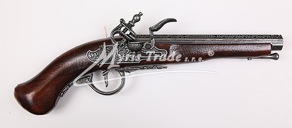 nefunkční replika historické křesadlové pistole ze dřeva a šedého kovu