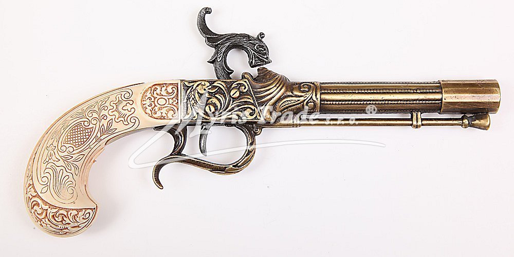 luxusně provedená nefunkční replika historické křesadlové pistole z dokonalé imitace slonové kosti a kovu v barvě bronzu