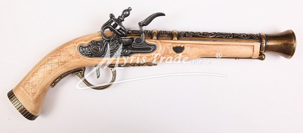 luxusně provedená nefunkční replika historické křesadlové pistole z dokonalé imitace slonové kosti a kovu barvy bronzu