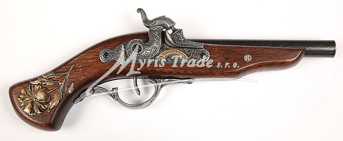 nefunkční replika historické křesadlové pistole ze dřeva s ozdobnými mosaznými provky