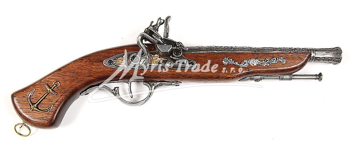 nefunkční replika historické křesadlové pistole ze dřeva s ozdobnými mosaznými provky