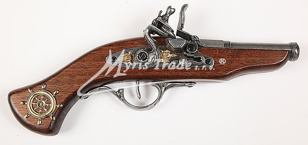 nefunkční replika historické křesadlové pistole ze dřeva s ozdobnými mosaznými provky