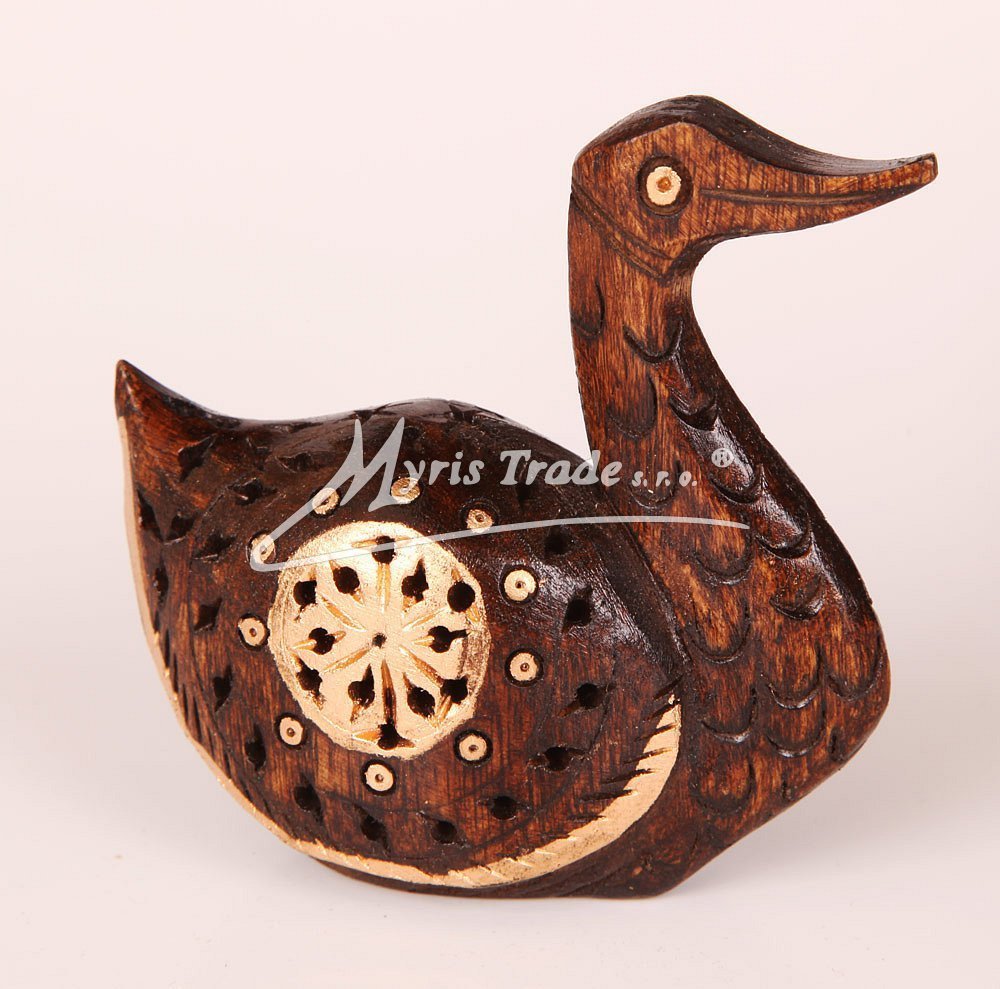 ozdobná, vyřezávaná figurka kachny, zdobená dekorem ve zlaté barvě