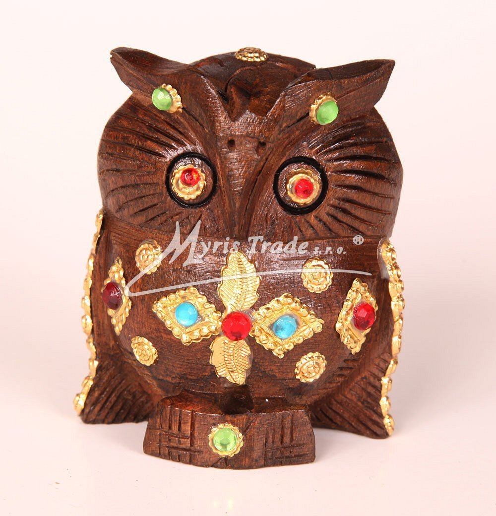 sova dřevěná - zdobená mosazí a barvnými kamínky