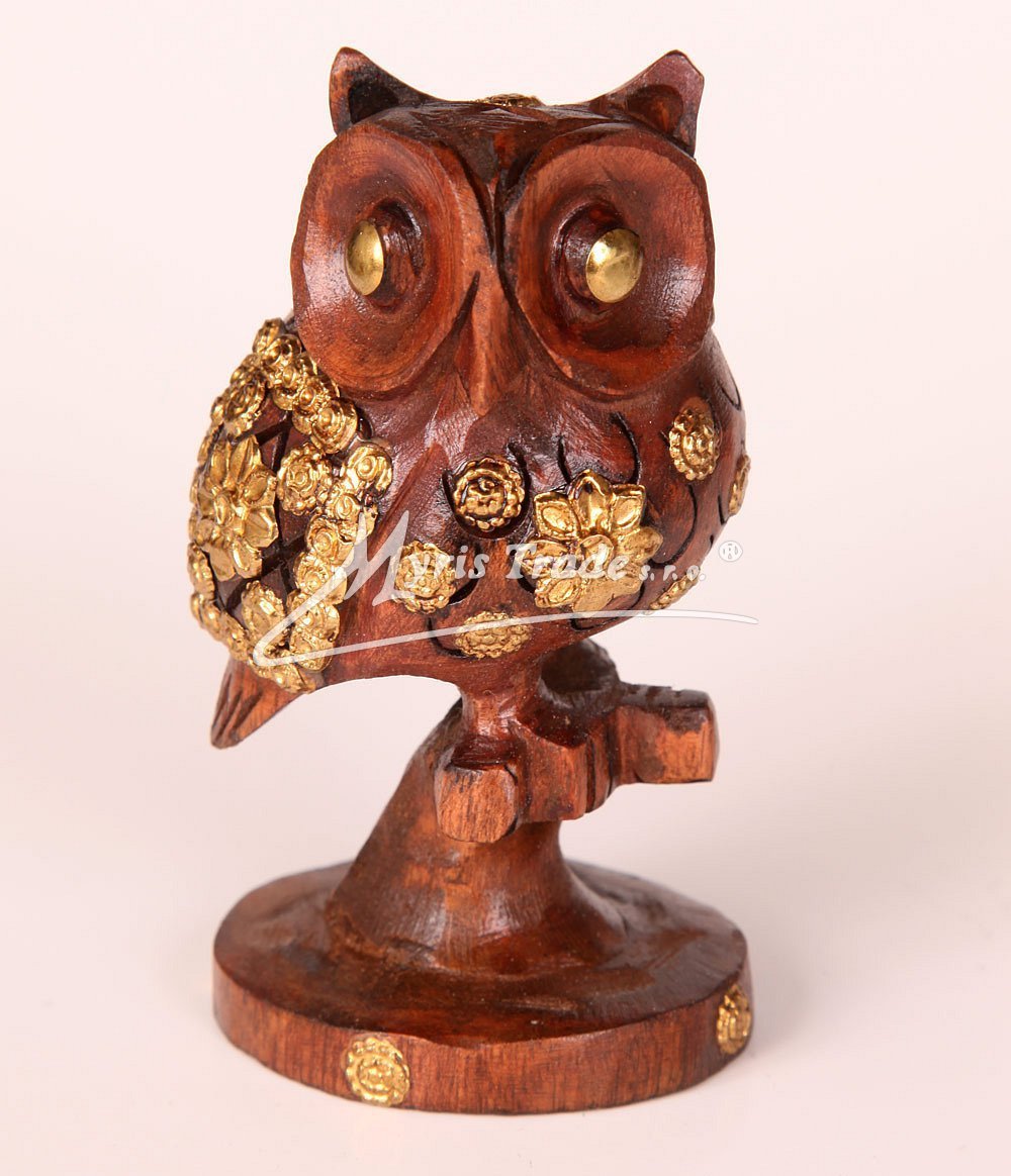 sova dřevěná - ručně vyřezávaná, zdobená mosazí, tmavé dřevo
