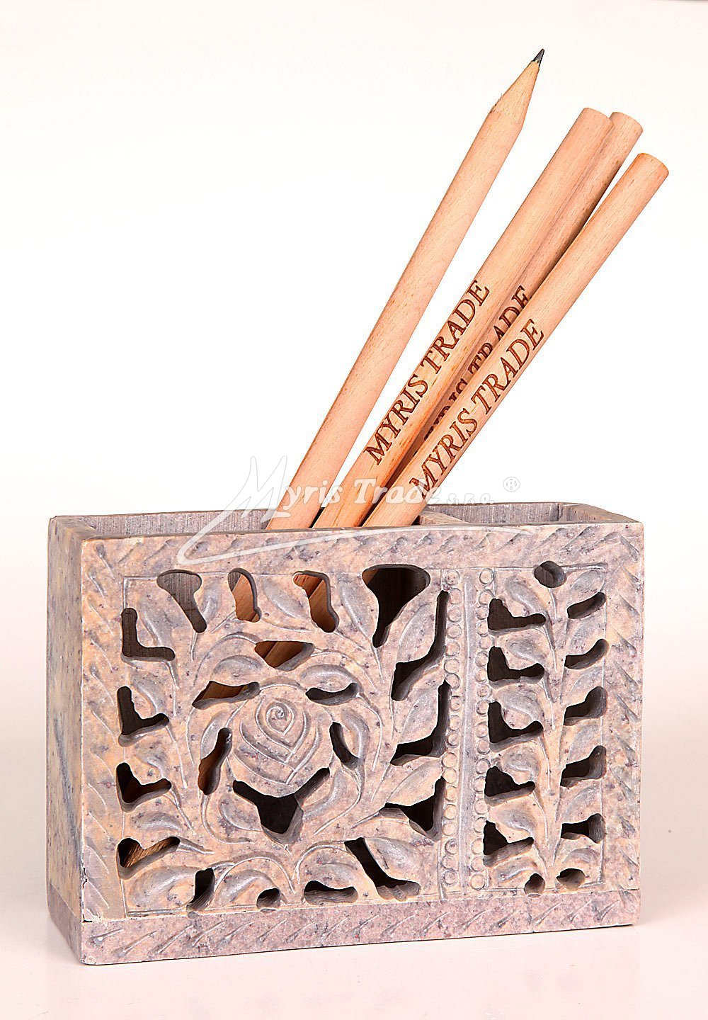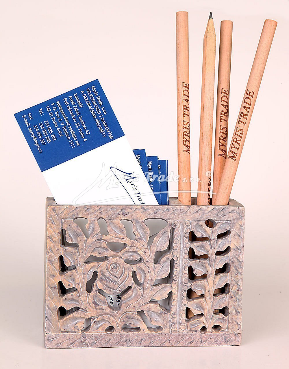 ručně vyřezávaný stojánek na tužky a vizitky je vyroben z kamene - mastku