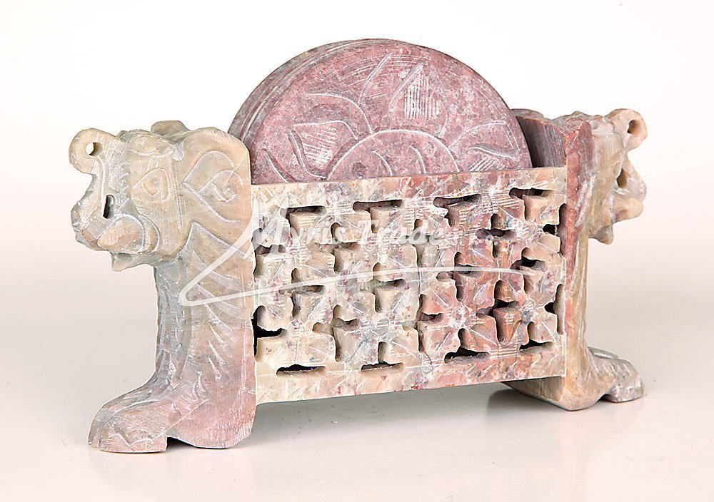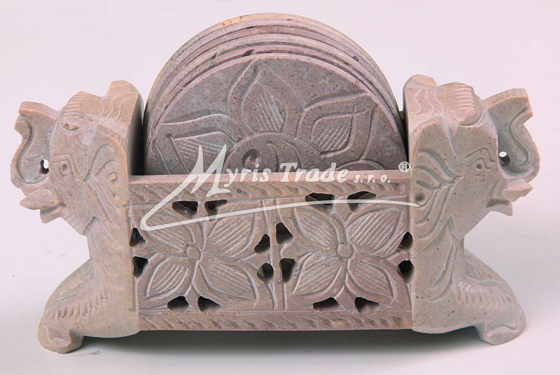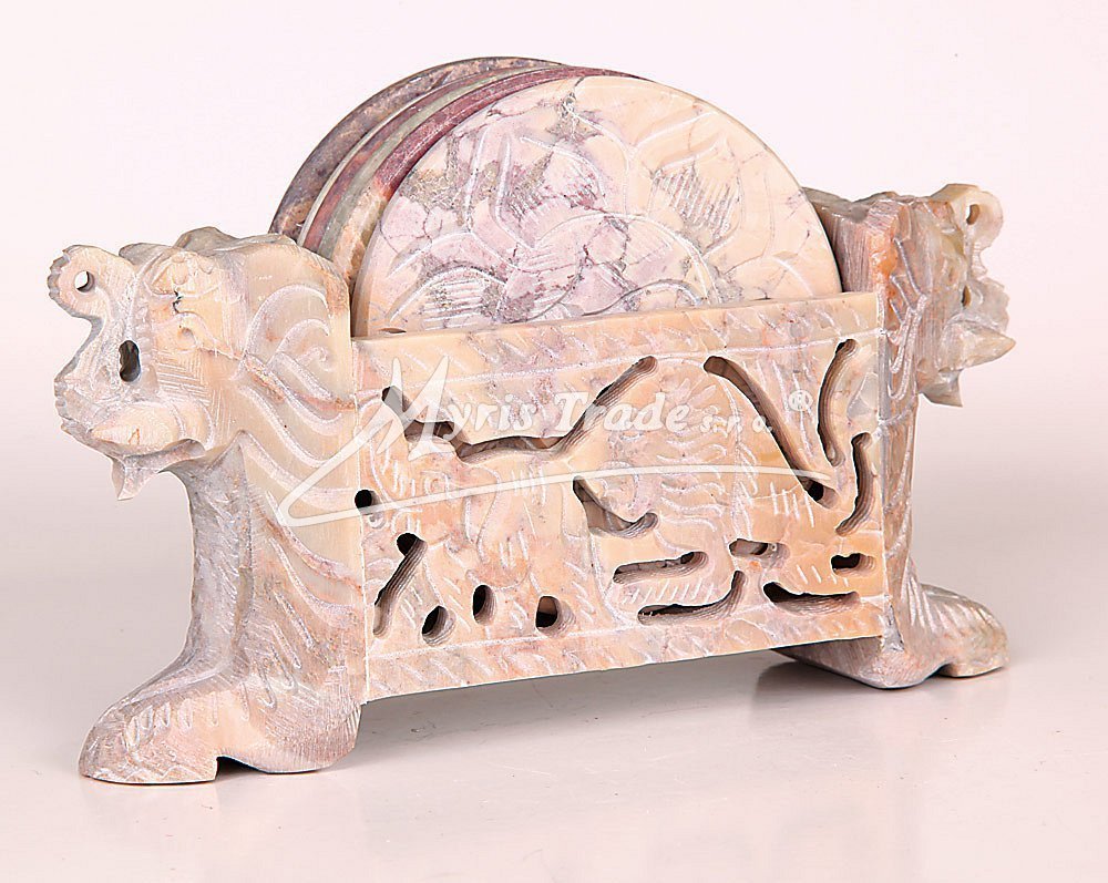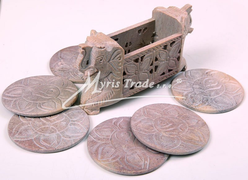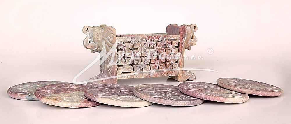 Ozdobný, vyřezávaný držák s 6ti podtácky pod skleničky z kamene (mastku). Barva i provedení na obrázku je pouze orientační. Každý kus je originální, a má svoji vlastní barvu, žíhání kamene a řezbu. Žádný kus není stejný.