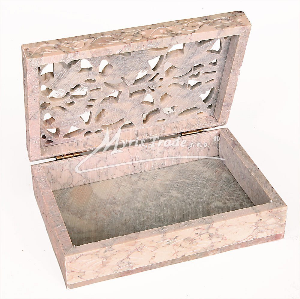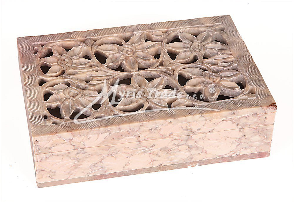 Šperkovnice z mastku s bohatě vyřezávaným víkem. Barva na obrázku je orientační. Každý kus je originální, a má svoji vlastní barvu a žíhání kamene. Žádný kus není stejný.