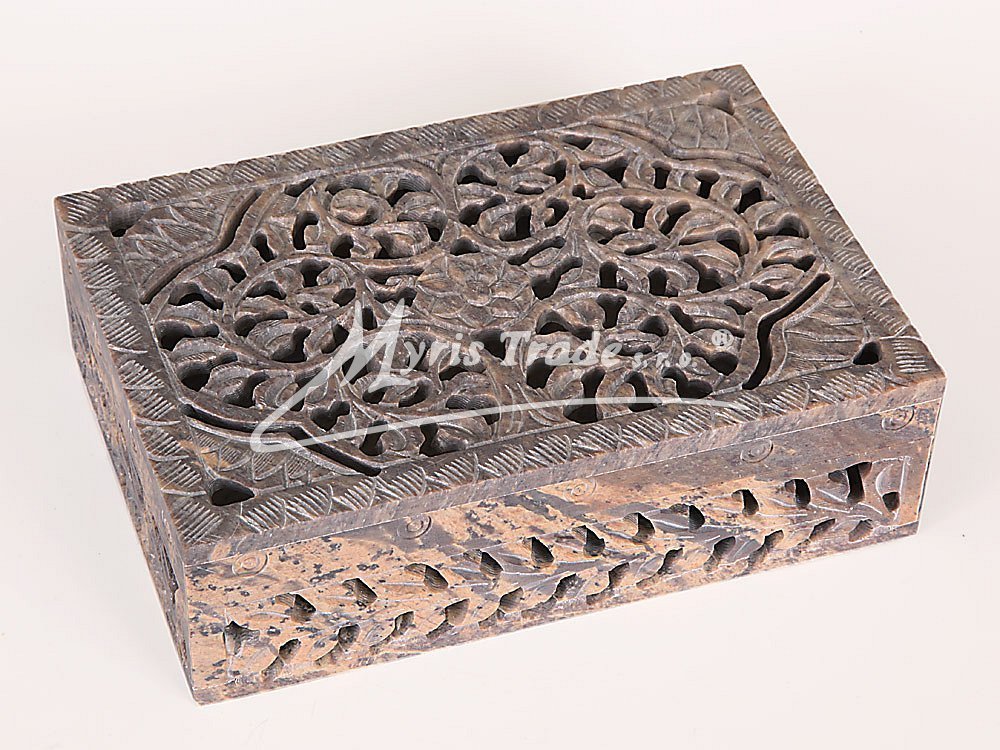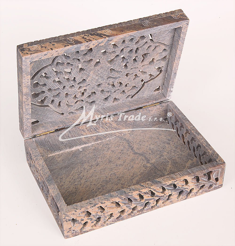 Šperkovnice z mastku s bohatě vyřezávaným víkem. Barva na obrázku je orientační. Každý kus je originální, a má svoji vlastní barvu a žíhání kamene. Žádný kus není stejný.