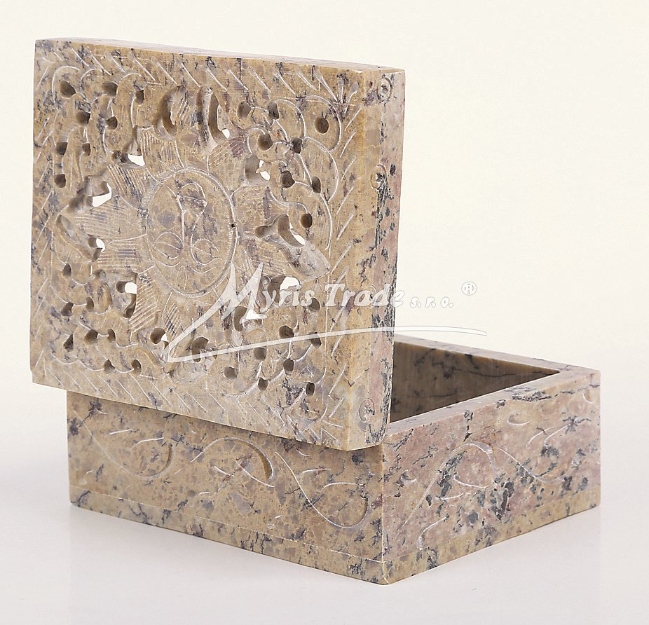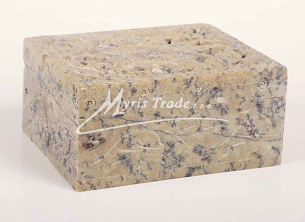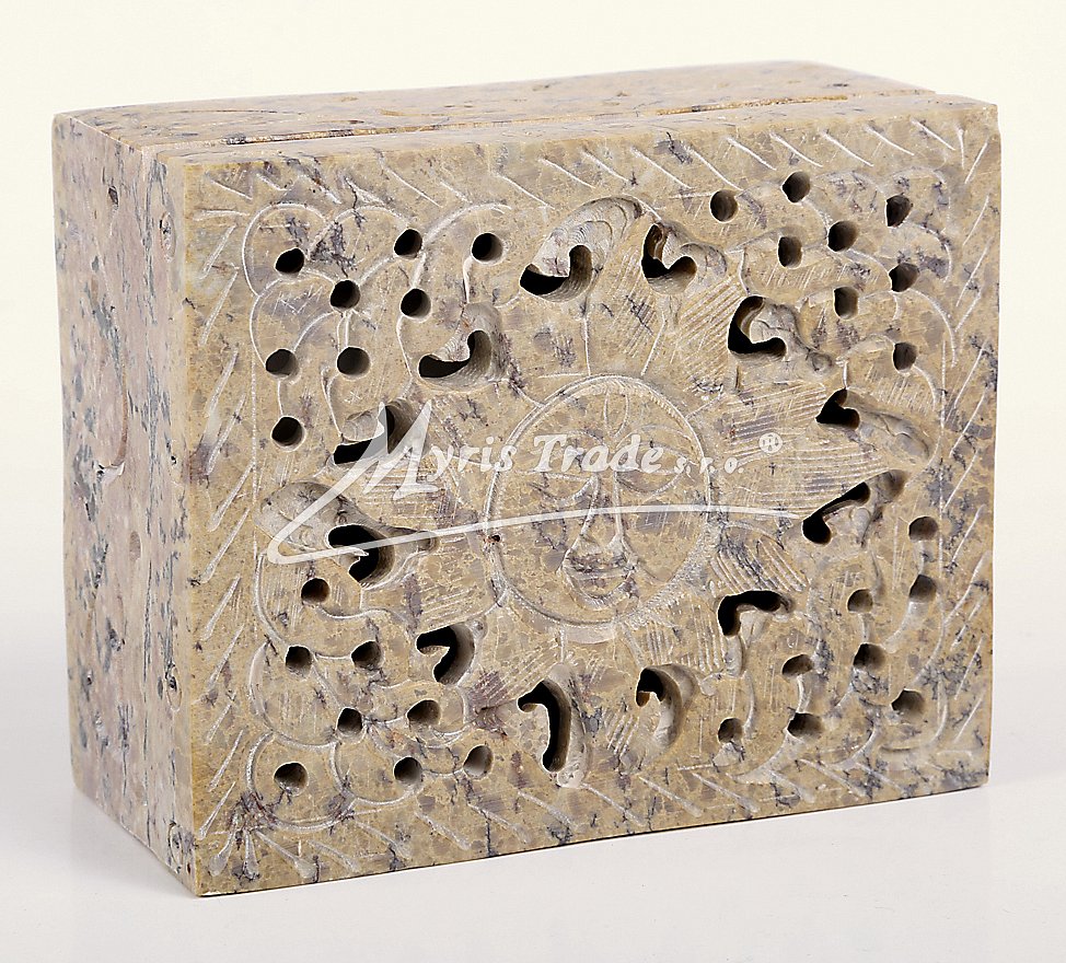 Šperkovnička z mastku s vyřezávaným víkem. Barva na obrázku je orientační. Každý kus je originální, a má svoji vlastní barvu a žíhání kamene. Žádný kus není stejný.