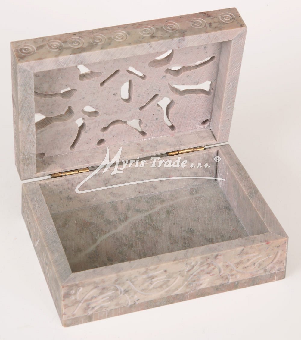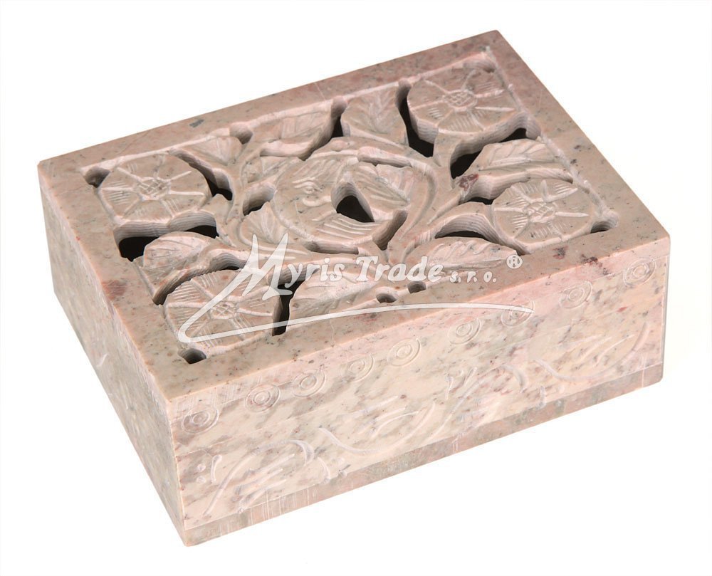 Šperkovnička z mastku s vyřezávaným víkem. Barva na obrázku je orientační. Každý kus je originální, a má svoji vlastní barvu a žíhání kamene. Žádný kus není stejný.