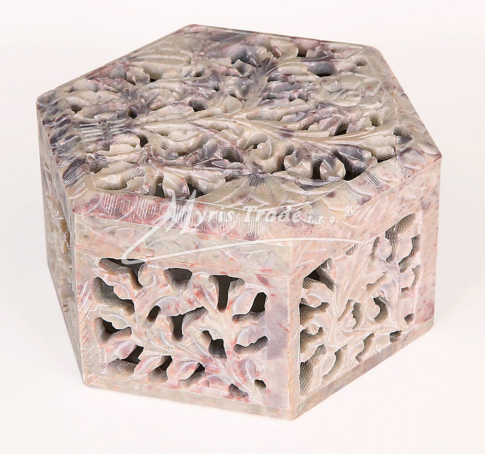 Šperkovnice z mastku s bohatě vyřezávaným víkem. Barva na obrázku je orientační. Každý kus je originální, a má svoji vlastní barvu a žíhání kamene. Žádný kus není stejný.