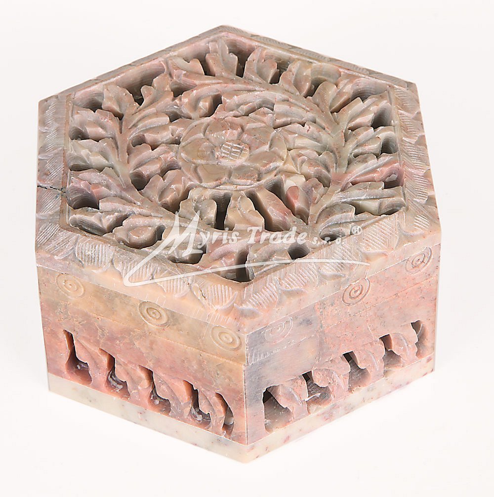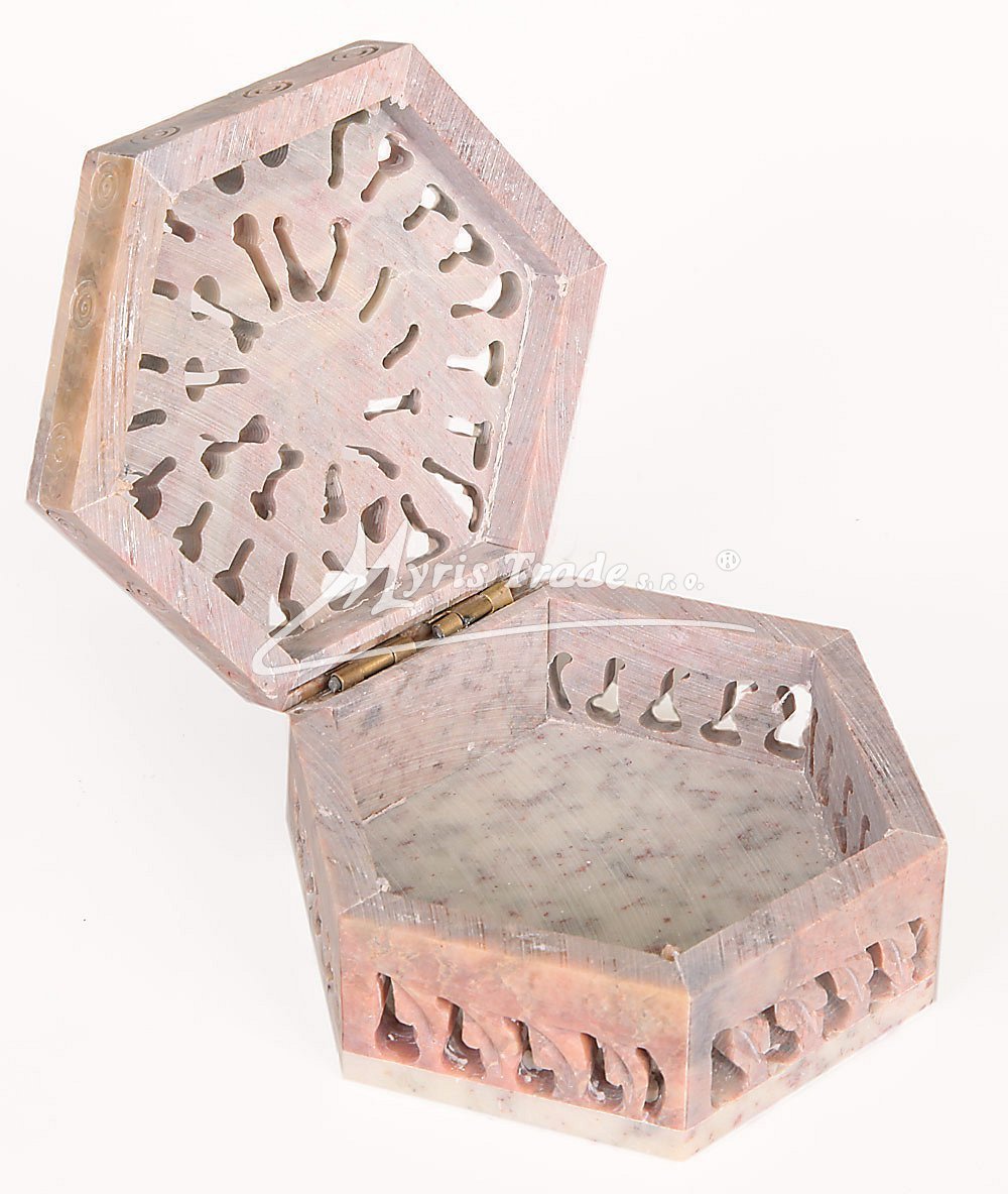 Šperkovnice z mastku s bohatě vyřezávaným víkem. Barva na obrázku je orientační. Každý kus je originální, a má svoji vlastní barvu a žíhání kamene. Žádný kus není stejný.
