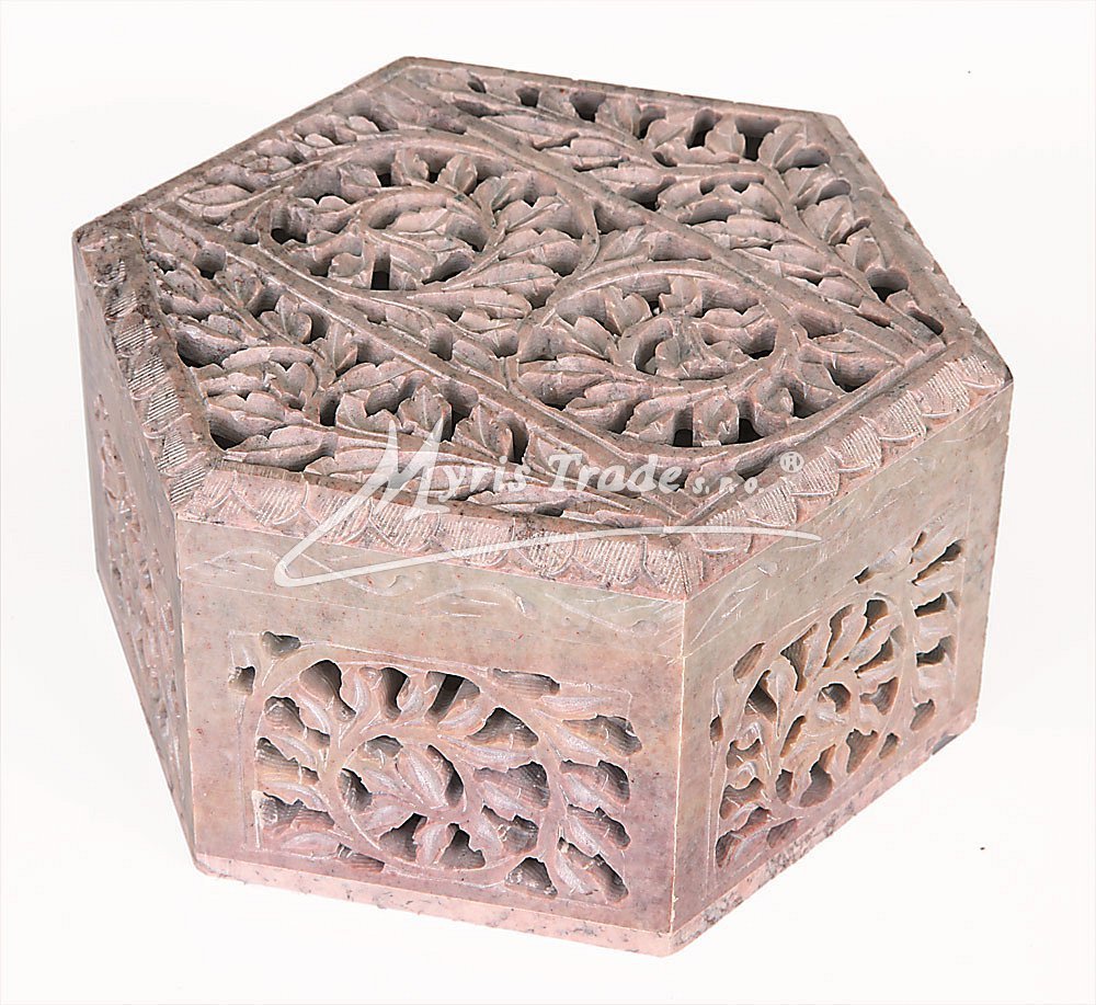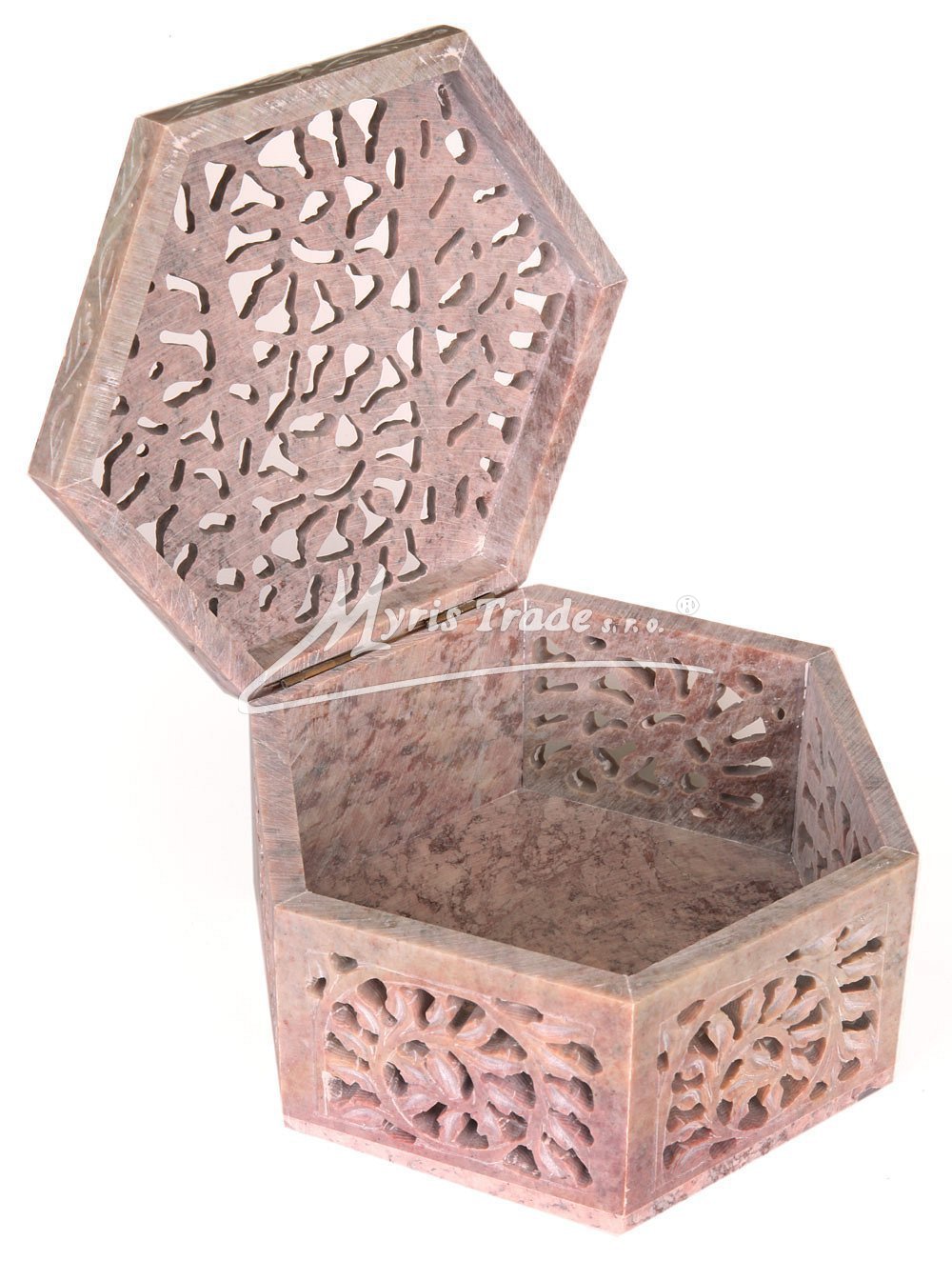 Šperkovnice z mastku s bohatě vyřezávaným víkem. Barva na obrázku je orientační. Každý kus je originální, a má svoji vlastní barvu a žíhání kamene. Žádný kus není stejný.
