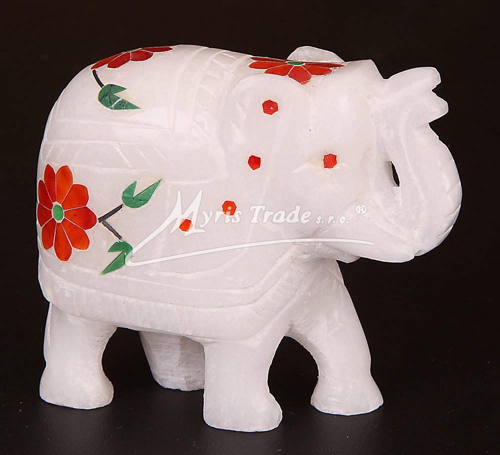 figurka slona vyřezaná z bílého mramoru vykládaná různými druhy polodrahokamů a perleti