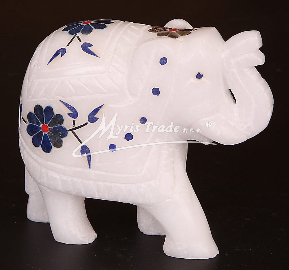 figurka slona vyřezaná z bílého mramoru vykládaná různými druhy polodrahokamů a perleti