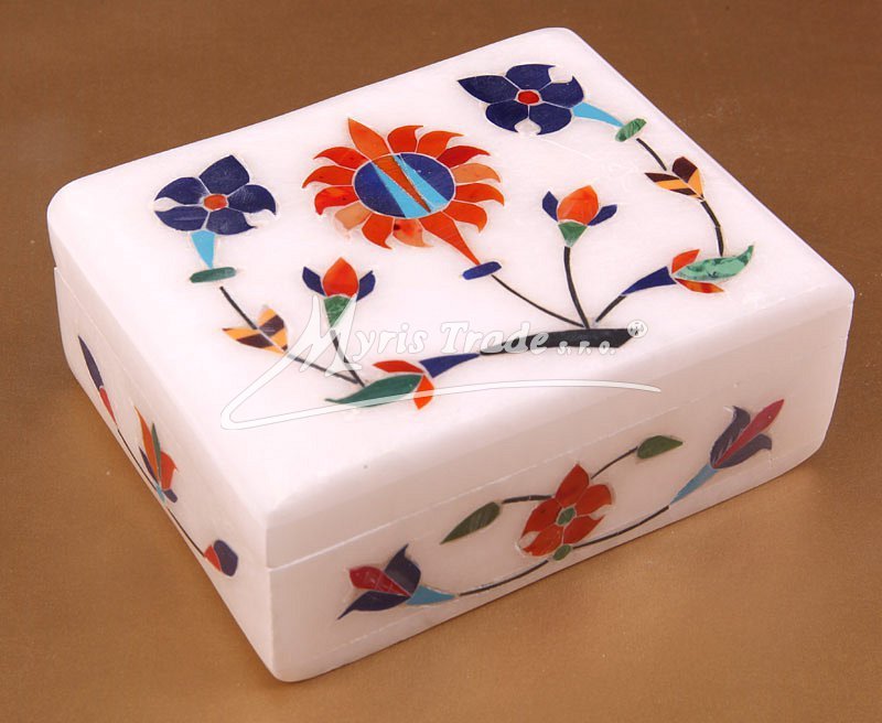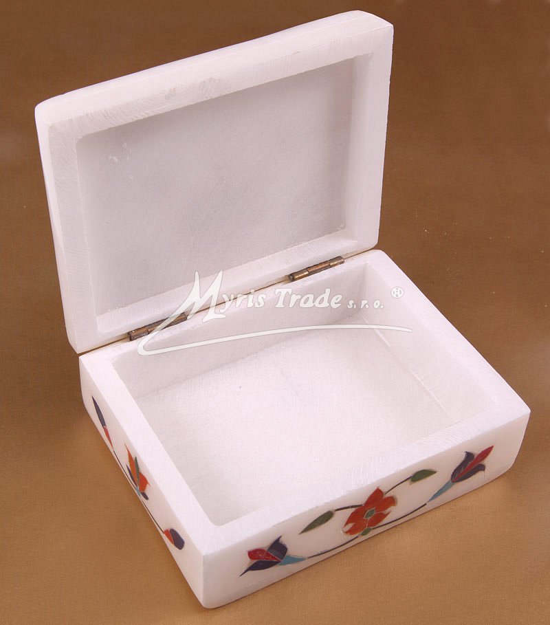 Krabička je vyrobena z bílého mramoru a vykládaná polodrahokamy na víku i ze stran. Každá krabička je originálně zdobená a jejich motivy mohou být různé.