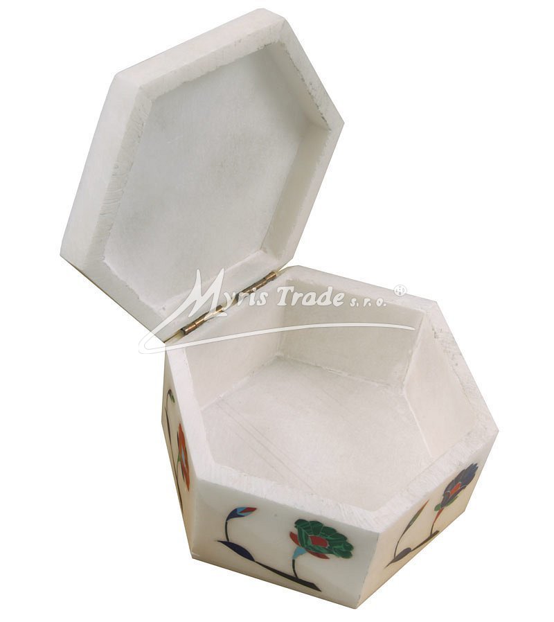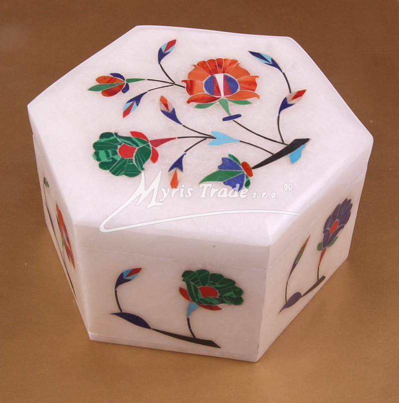 Krabička je vyrobena z bílého mramoru a vykládaná polodrahokamy na víku i ze stran. Každá krabička je originálně zdobená a jejich motivy mohou být různé.