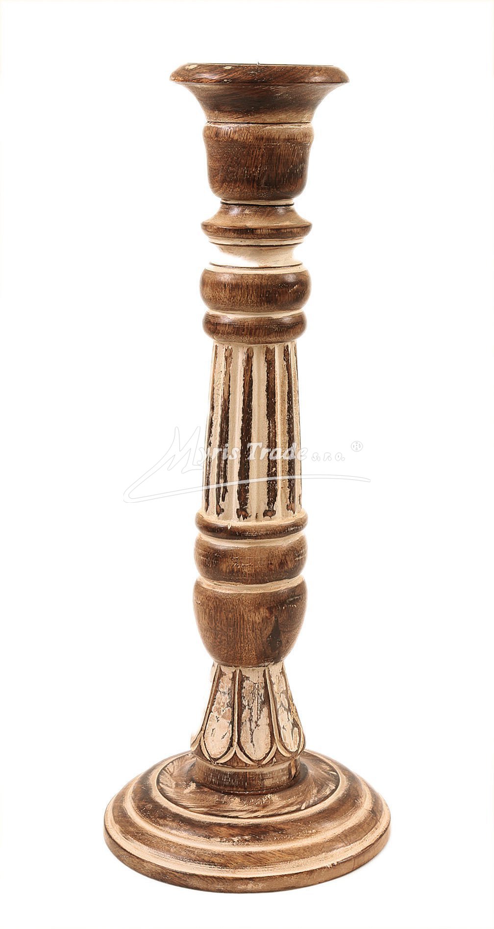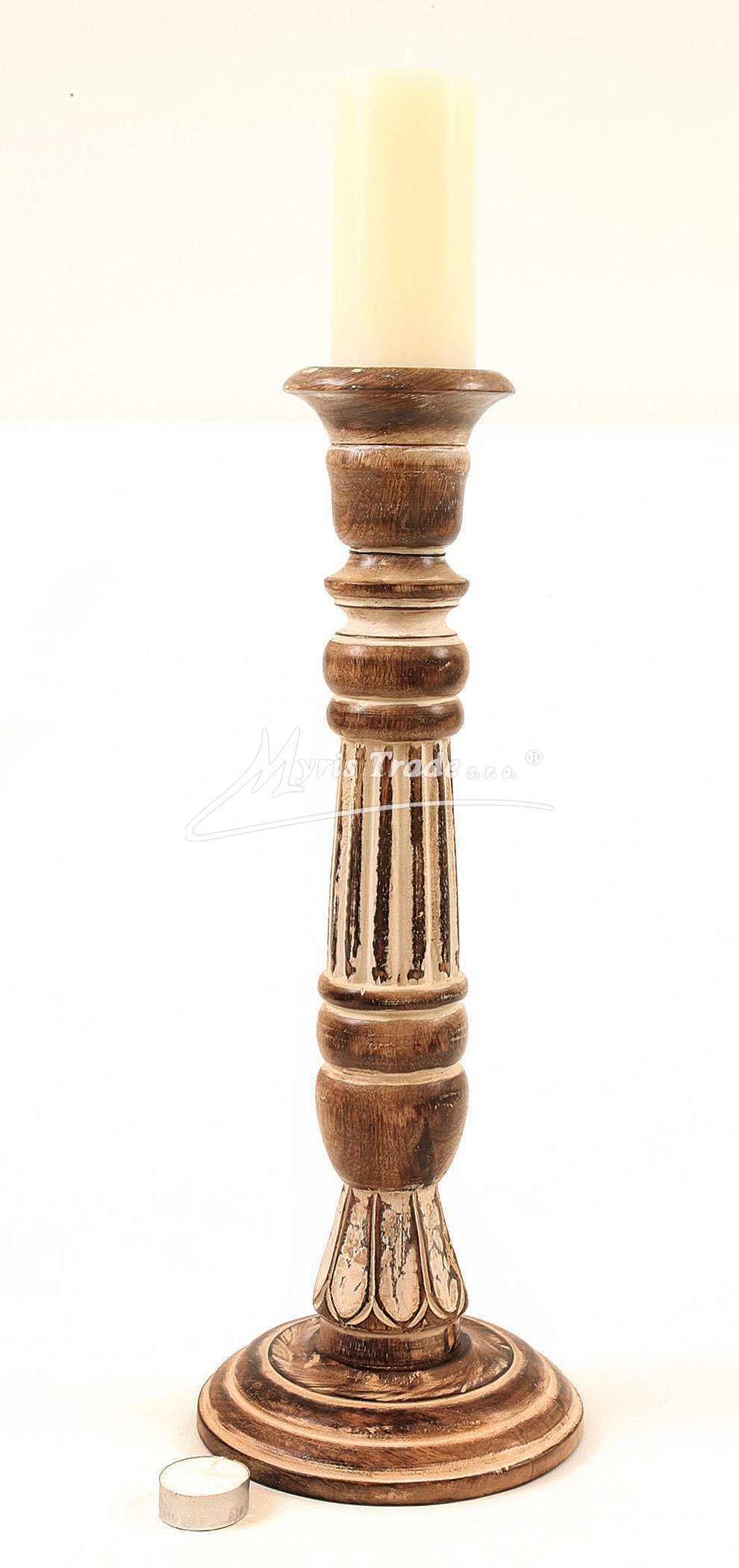 masivní, dřevěný, ručně vyřezávaný svícen v bílé a přírodní barvě se starožitnou patinou