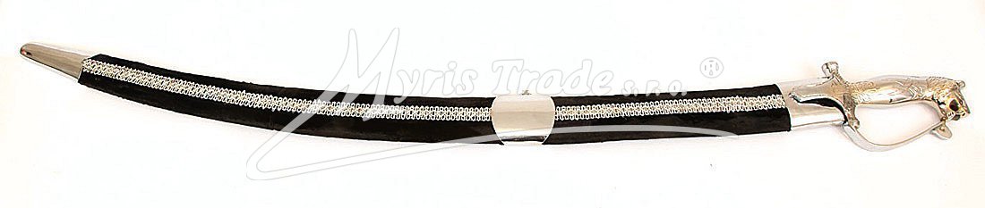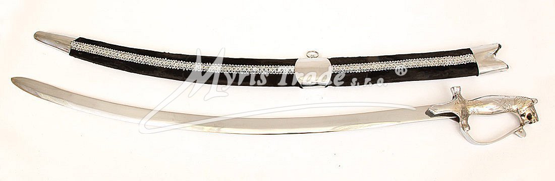 Replika historické orientální šavle s ozdobnou tepanou rukojetí ve stříbrné barvě a v pochvě potažené sametem v černé barvě. Šavle je určena nejen pro dekoraci, ale protože je vyvážená, skvěle se hodí i pro orientální břišní tance.
