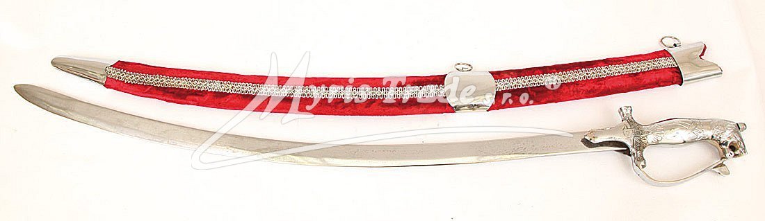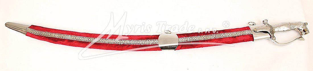 Replika historické orientální šavle s ozdobnou tepanou rukojetí ve stříbrné barvě a v pochvě potažené sametem v červené barvě. Šavle je určena nejen pro dekoraci, ale protože je vyvážená, skvěle se hodí i pro orientální břišní tance.