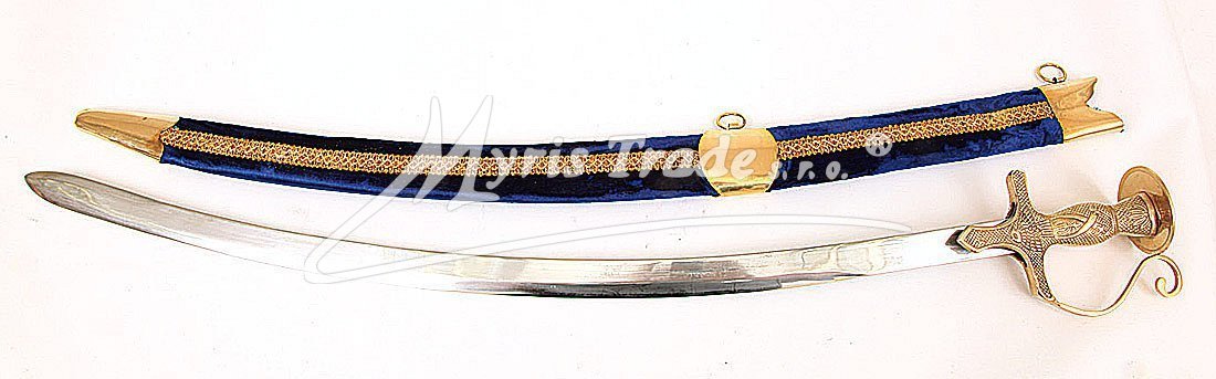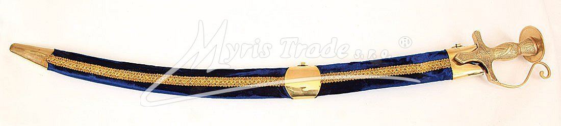 Replika historické orientální šavle s ozdobnou mosaznou tepanou rukojetí v pochvě potažené sametem v tmavě modré barvě. Šavle je určena nejen pro dekoraci, ale protože je vyvážená, skvěle se hodí i pro orientální břišní tance.
