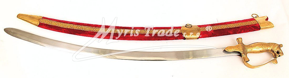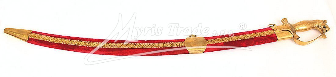 Replika historické orientální šavle s ozdobnou mosaznou tepanou rukojetí v pochvě potažené sametem v červené barvě. Šavle je určena nejen pro dekoraci, ale protože je vyvážená, skvěle se hodí i pro orientální břišní tance.