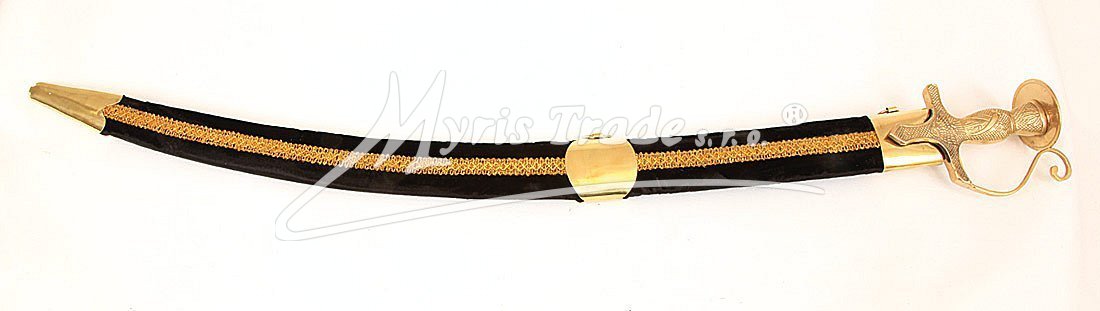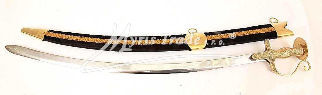 Replika historické orientální šavle s ozdobnou mosaznou tepanou rukojetí v pochvě potažené sametem v černé barvě. Šavle je určena nejen pro dekoraci, ale protože je vyvážená, skvěle se hodí i pro orientální břišní tance.