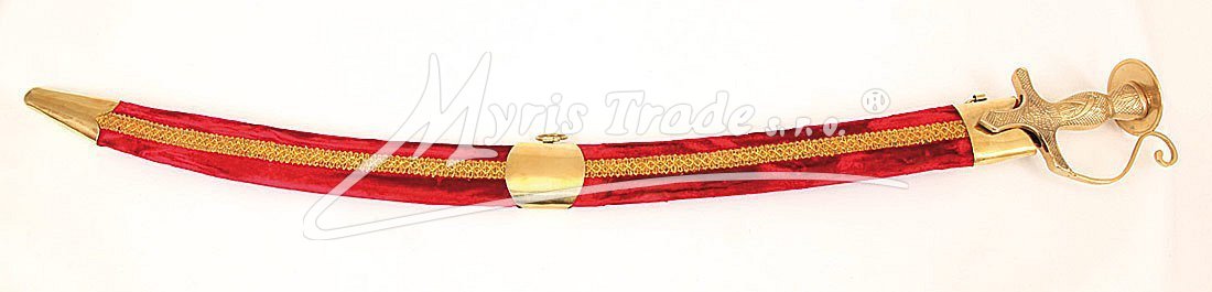 Replika historické orientální šavle s ozdobnou mosaznou tepanou rukojetí v pochvě potažené sametem v červené barvě. Šavle je určena nejen pro dekoraci, ale protože je vyvážená, skvěle se hodí i pro orientální břišní tance.