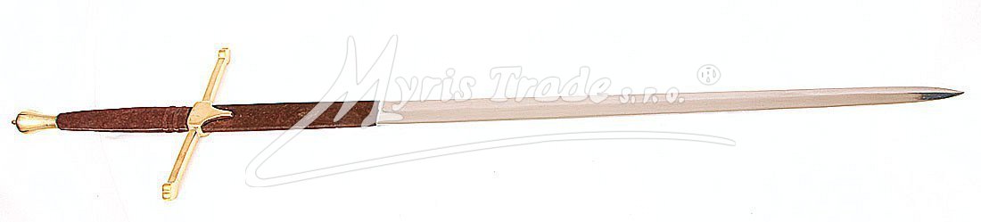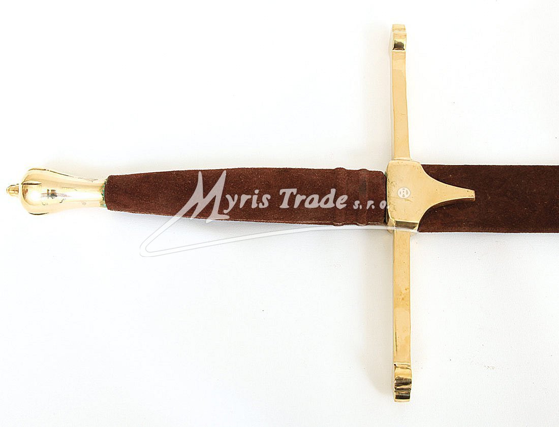 Replika dvouručního historického meče, svojí váhou a délkou věrně kopíruje klasické zbraně svého historického období. Rukojeť meče a horní část čepele je krytá hnědou semišovou kůží, meč je doplněn mosaznými prvky.