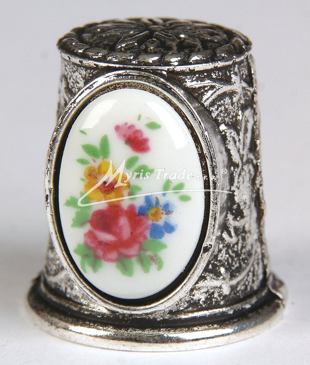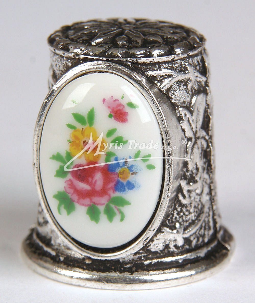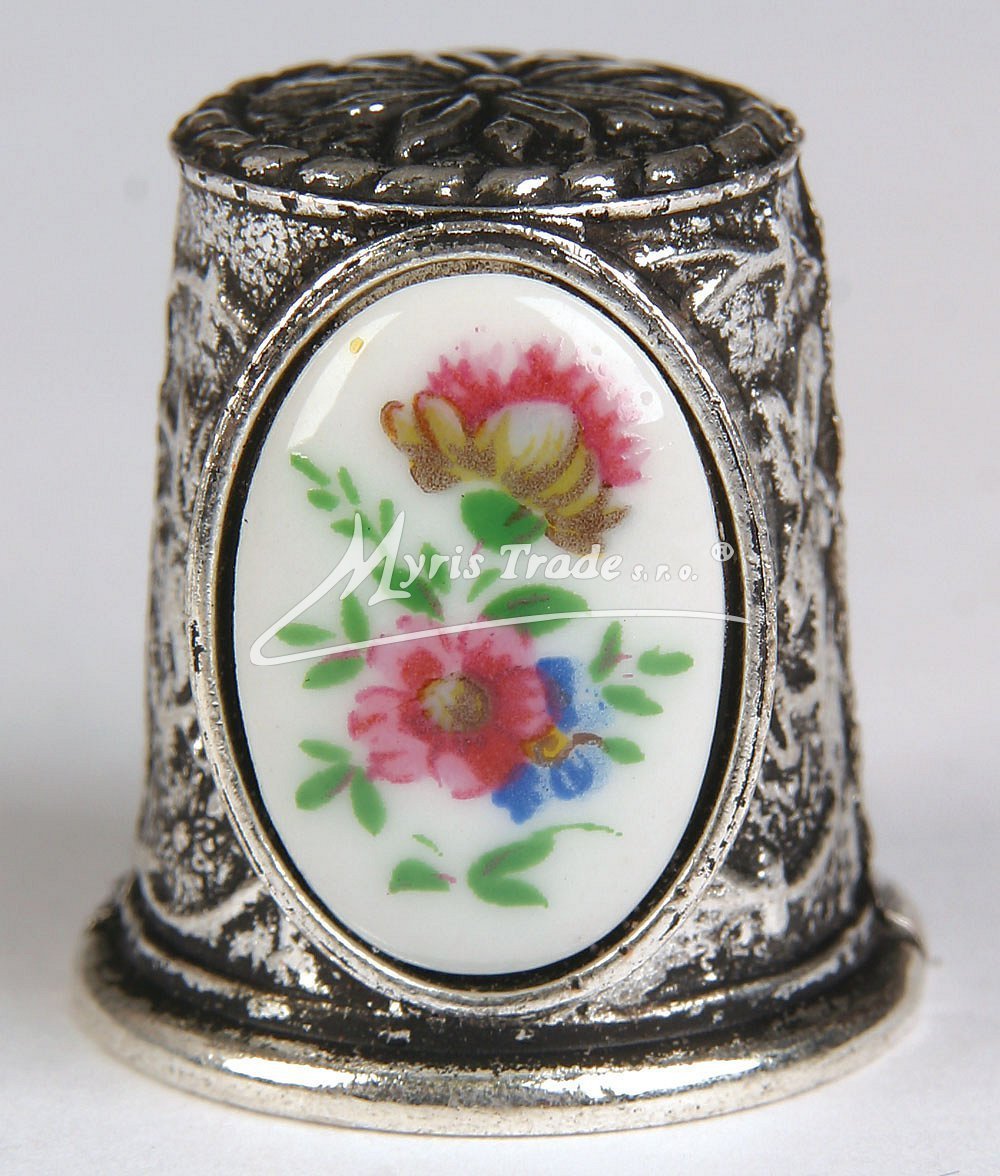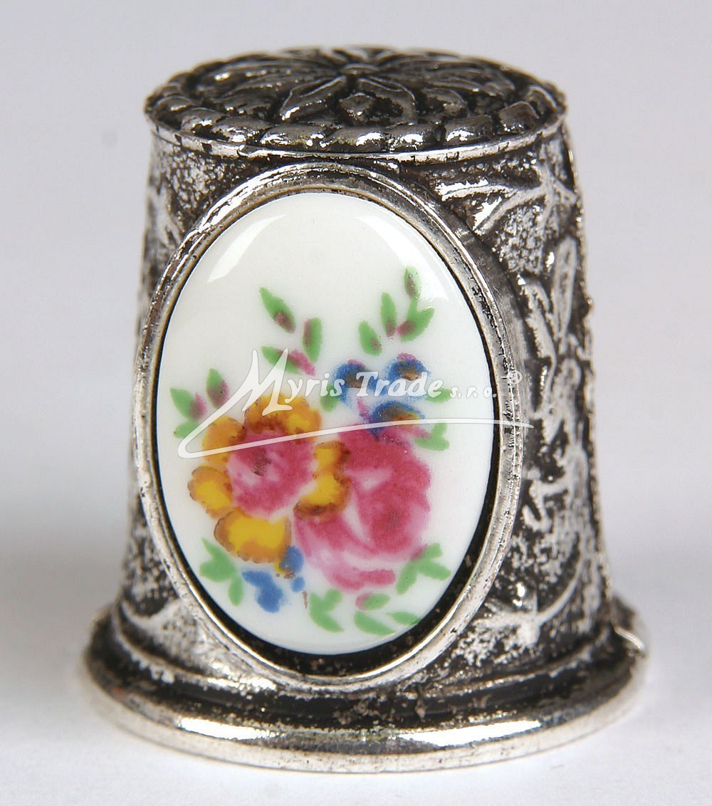 ozdobný náprstek ze stříbrného kovu a s keramickým obrázkem, s motivy různých květin