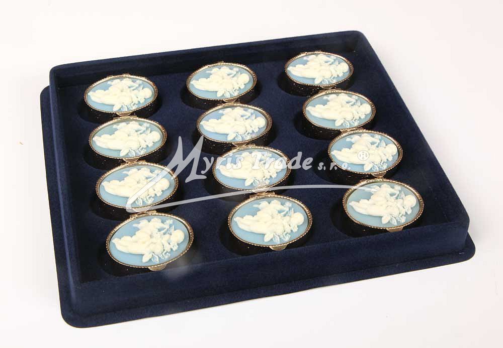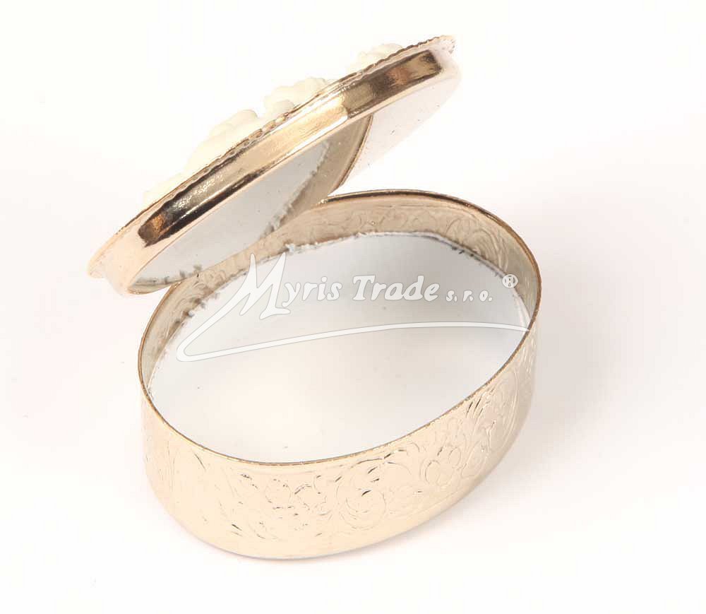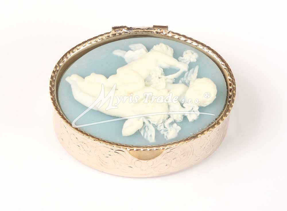 oválná lékovka je vyrobena z kovu zlaté barvy s ozdobným víčkem s kamejí s motivem andělů v barvě bleděmodré a slonovinové