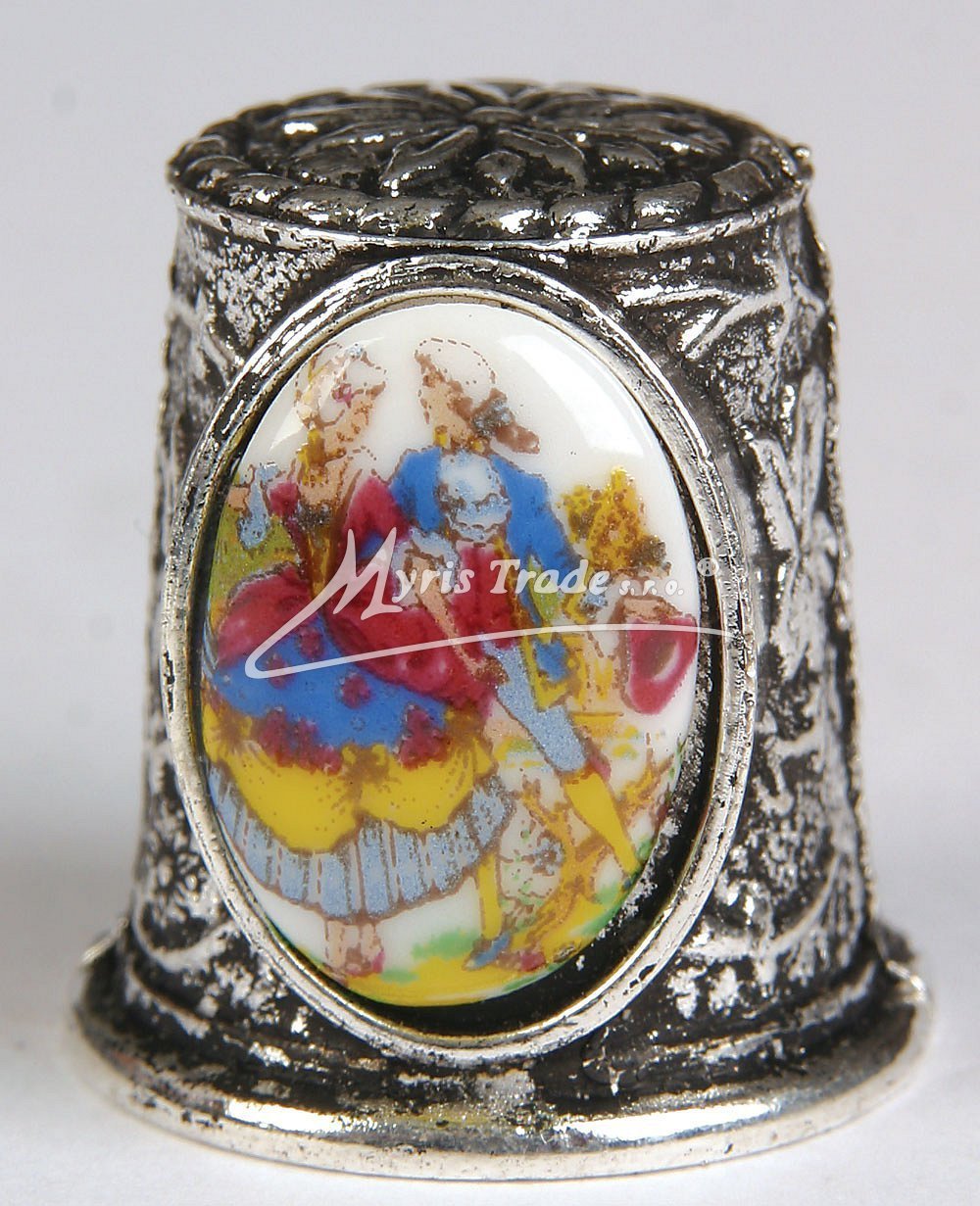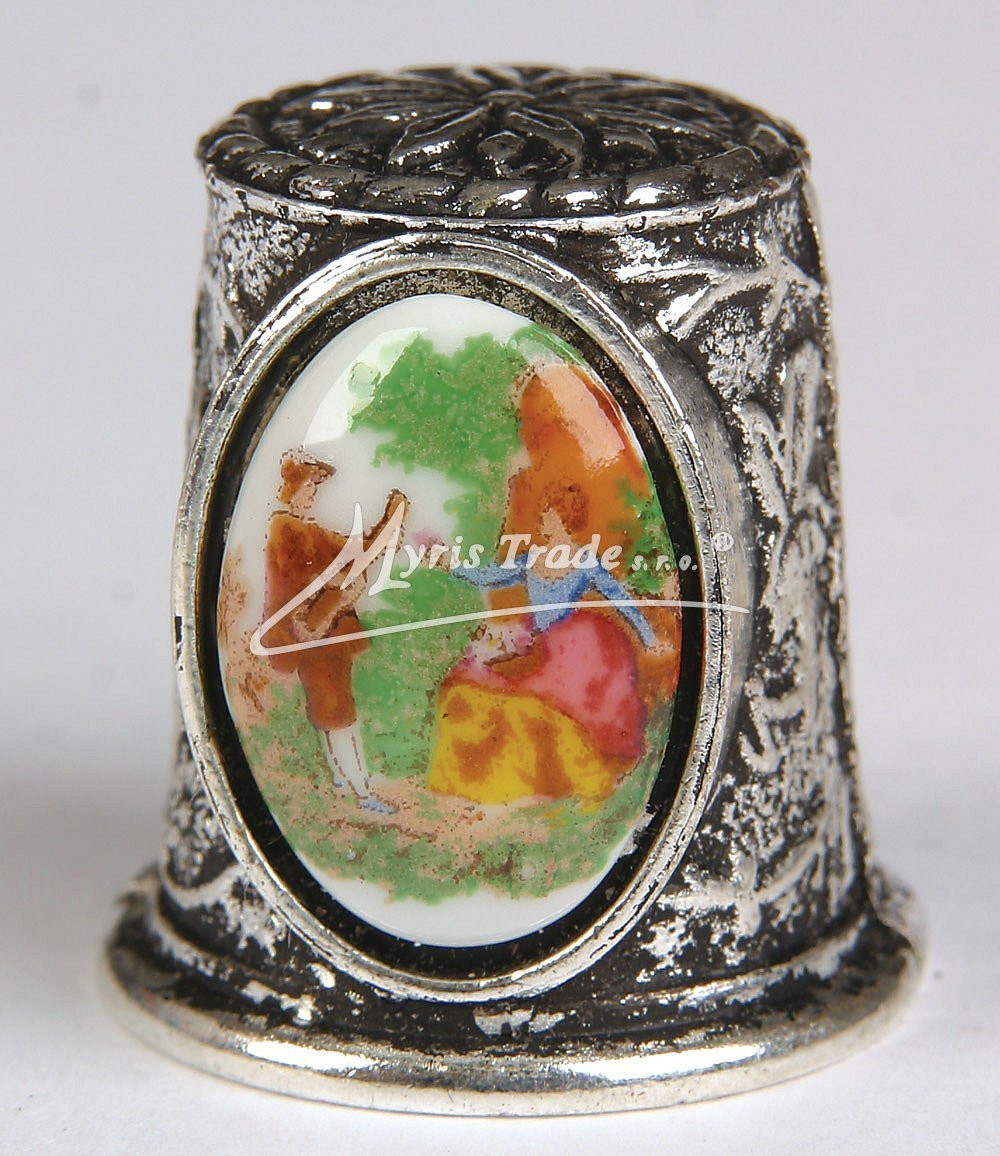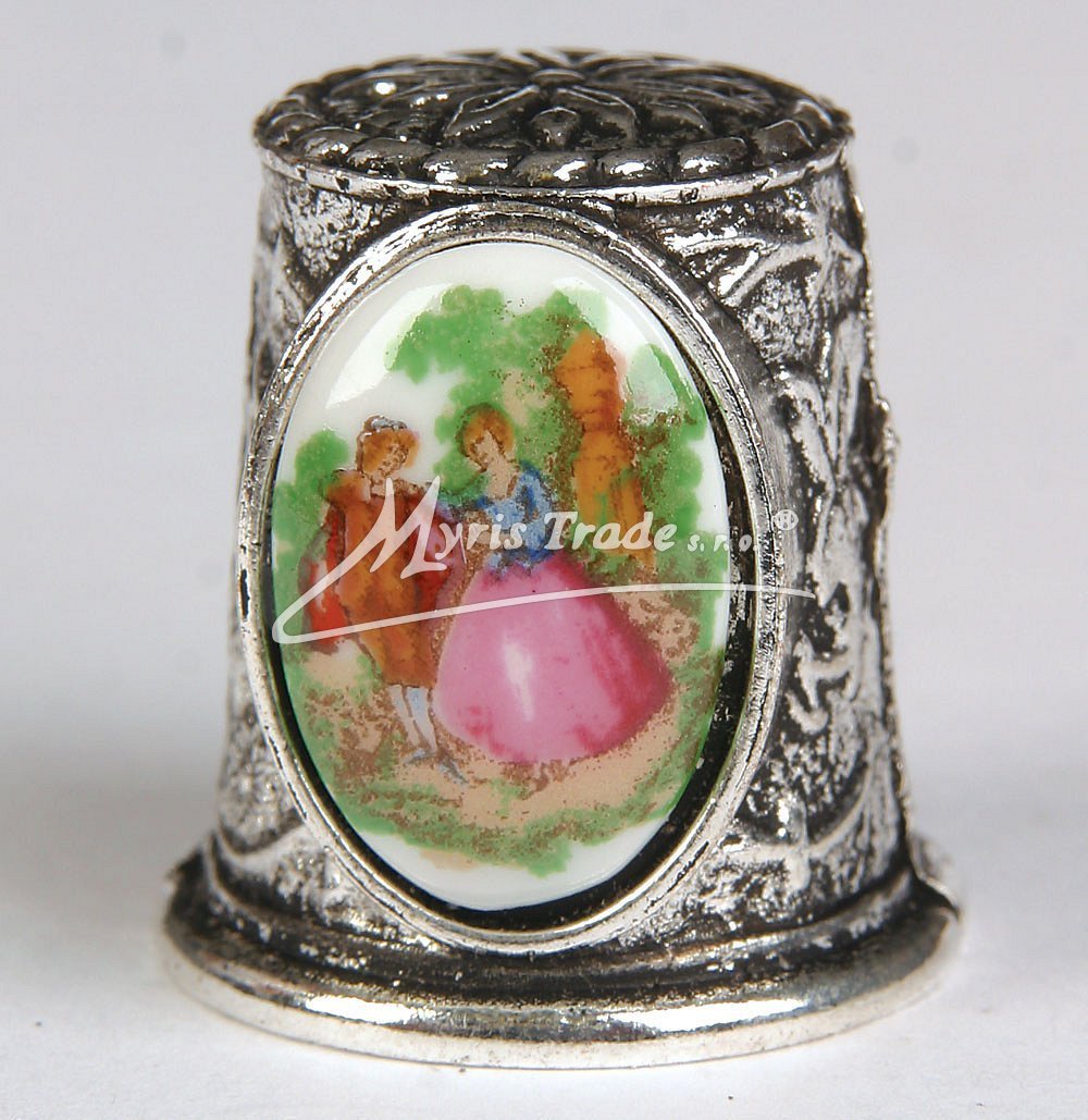 ozdobný náprstek ze stříbrného kovu a s keramickým obrázkem s motivy figur