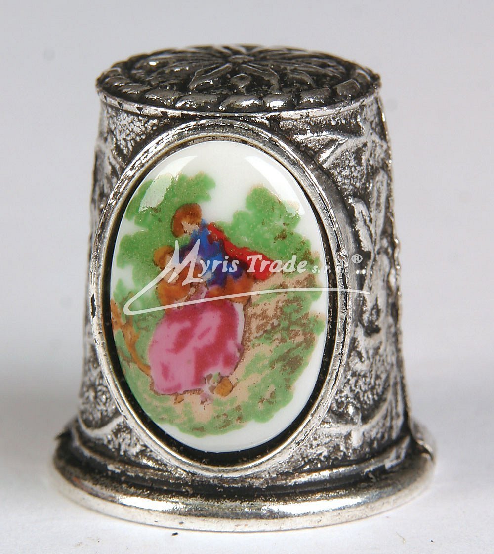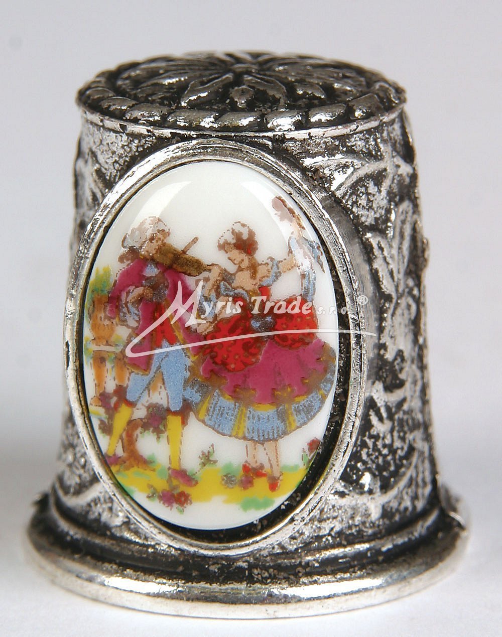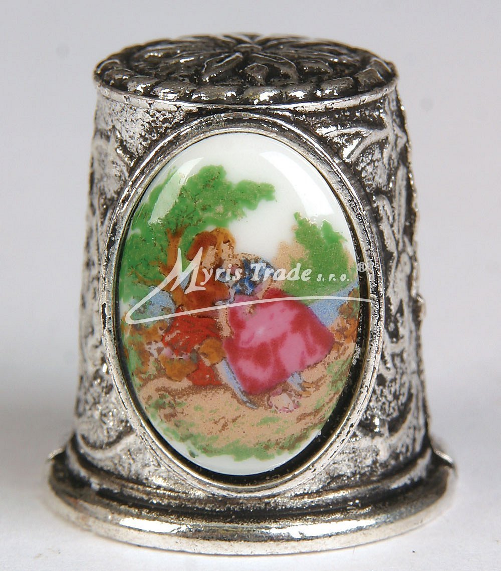 ozdobný náprstek ze stříbrného kovu a s keramickým obrázkem s motivy figur