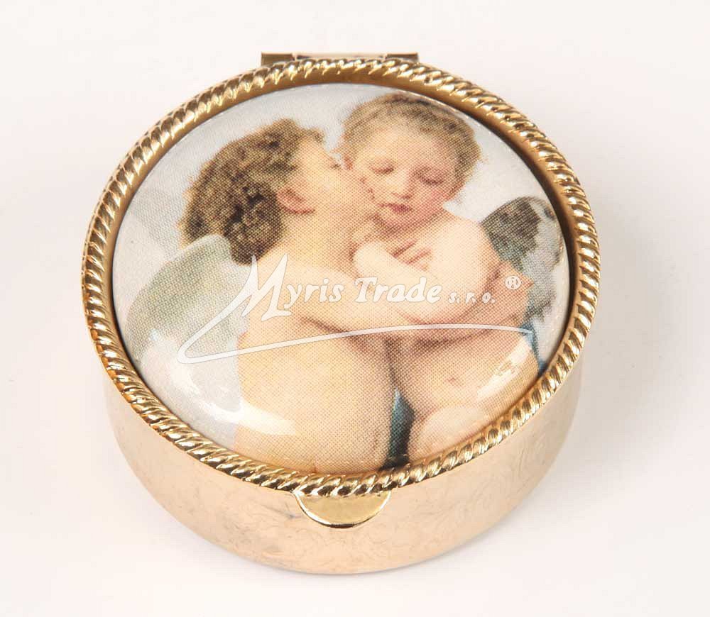 klasická kulatá lékovka je vyrobena z kovu zlaté barvy s porcelánovým víčkem s motivem andílků