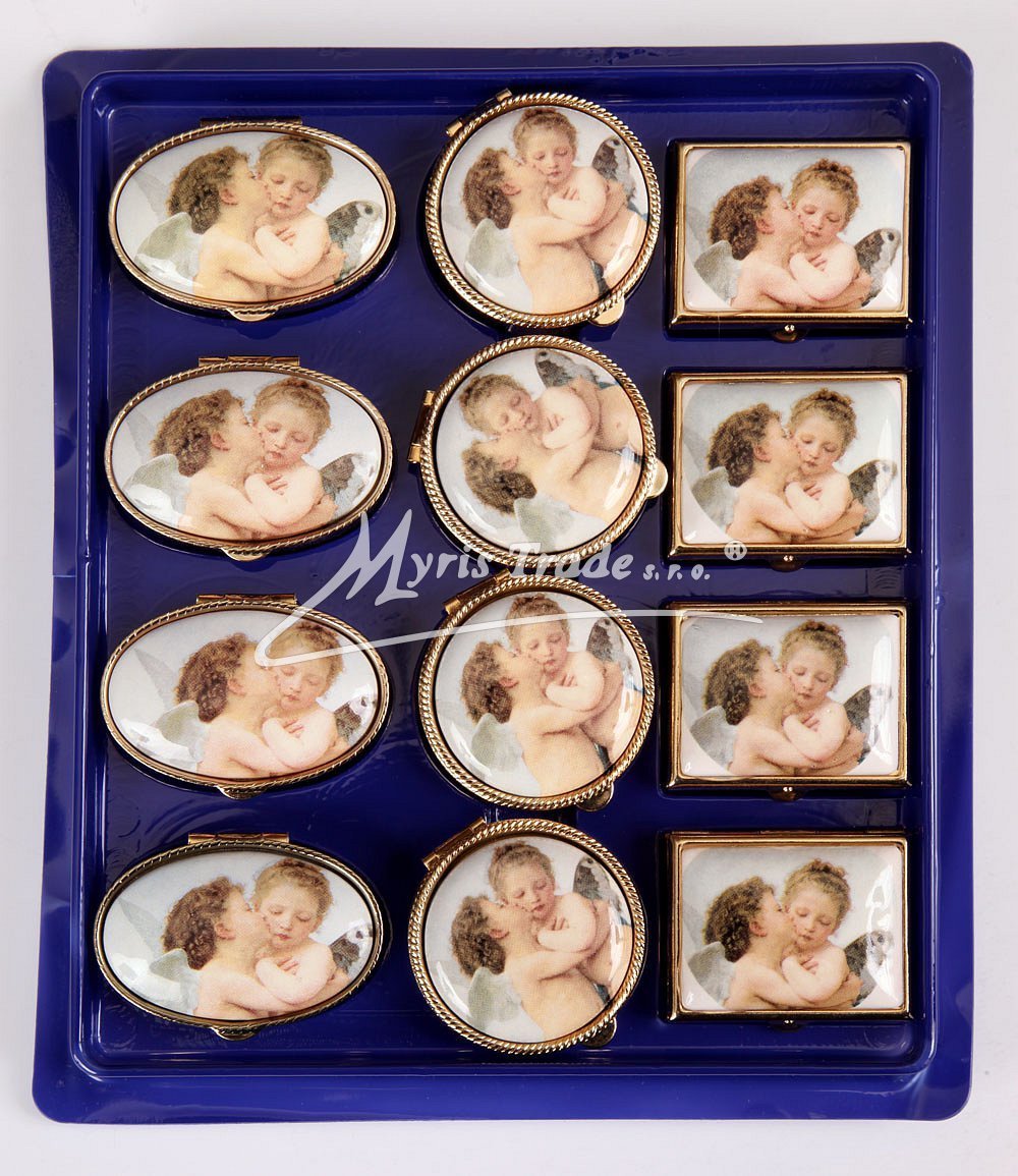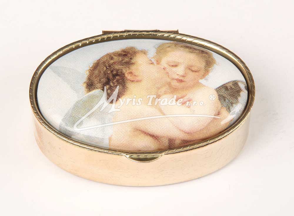 klasická oválná lékovka je vyrobena z kovu zlaté barvy s porcelánovým víčkem s motivem andílků