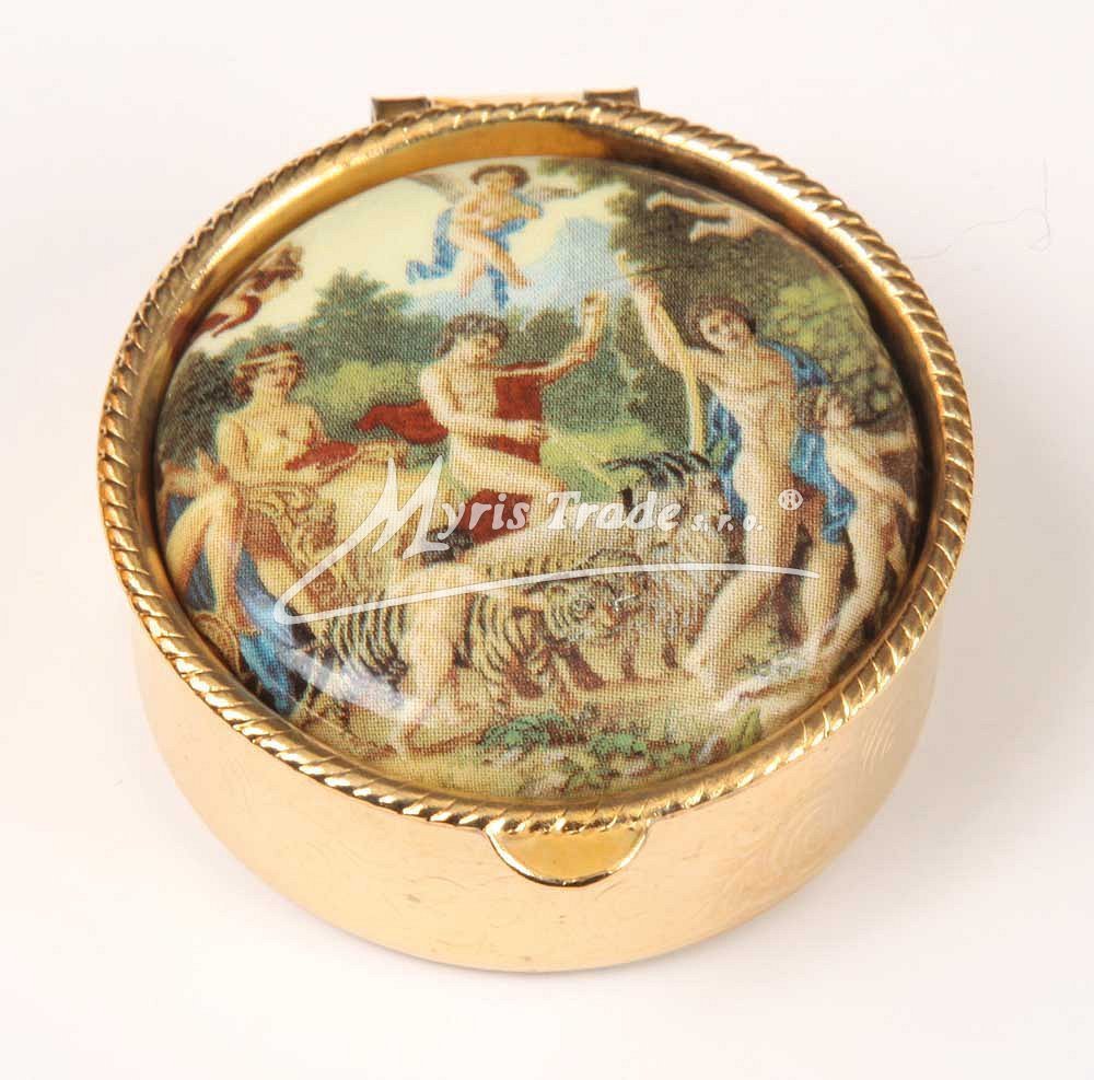 klasická obdélníková lékovka je vyrobena z kovu zlaté barvy s porcelánovým víčkem s Michelangelovými motivy ze Sixtinské kaple