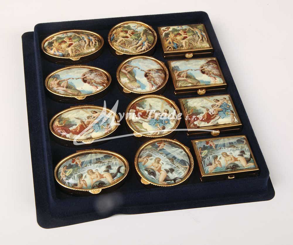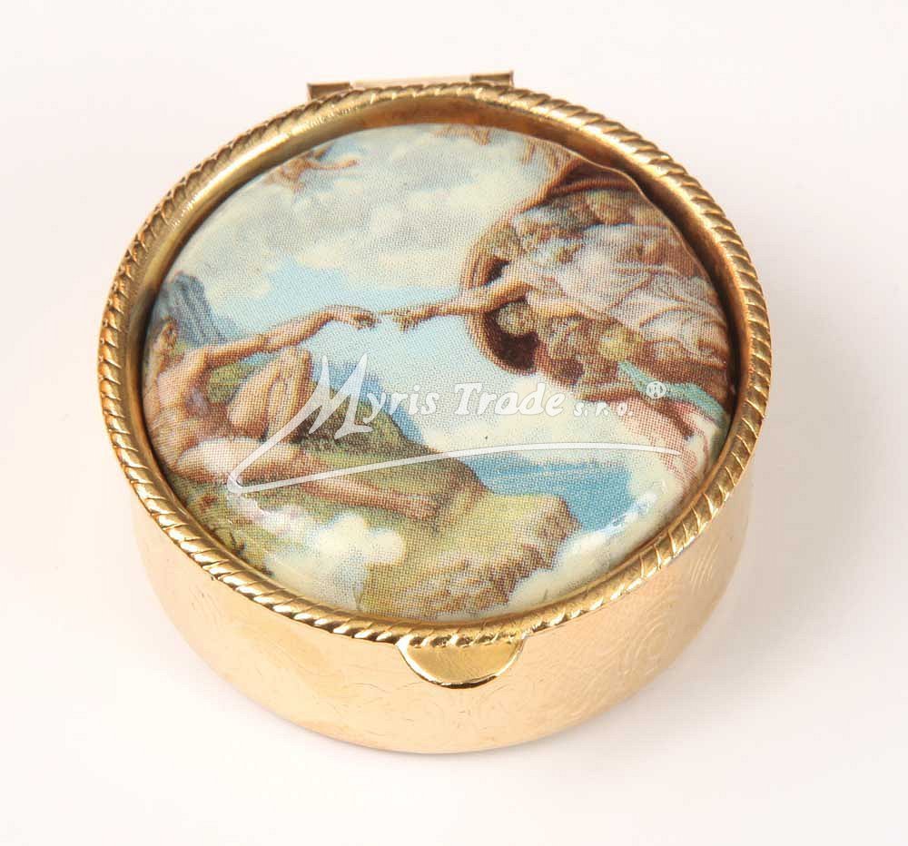 klasická obdélníková lékovka je vyrobena z kovu zlaté barvy s porcelánovým víčkem s Michelangelovými motivy ze Sixtinské kaple