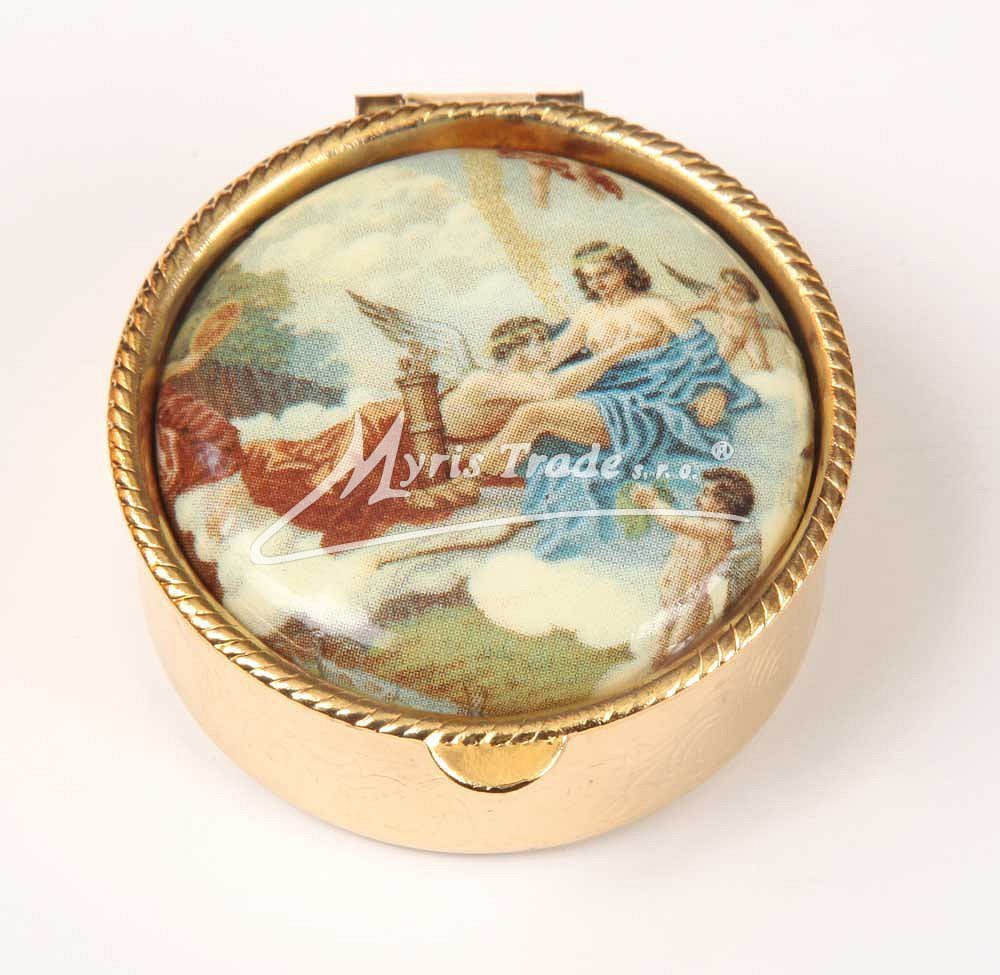 klasická obdélníková lékovka je vyrobena z kovu zlaté barvy s porcelánovým víčkem s Michelangelovými motivy ze Sixtinské kaple