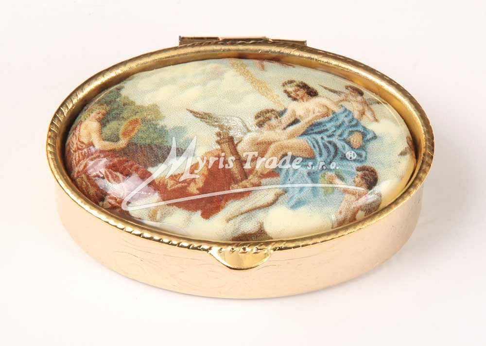 klasická oválná lékovka je vyrobena z kovu zlaté barvy s porcelánovým víčkem s Michelangelovými motivy ze Sixtinské kaple