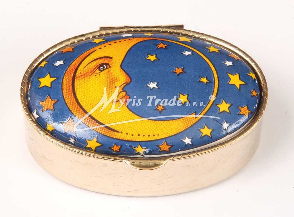 klasická oválná lékovka je vyrobena z kovu zlaté barvy s porcelánovým víčkem s romantickým motivem