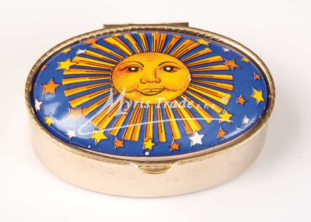 klasická oválná lékovka je vyrobena z kovu zlaté barvy s porcelánovým víčkem s romantickým motivem
