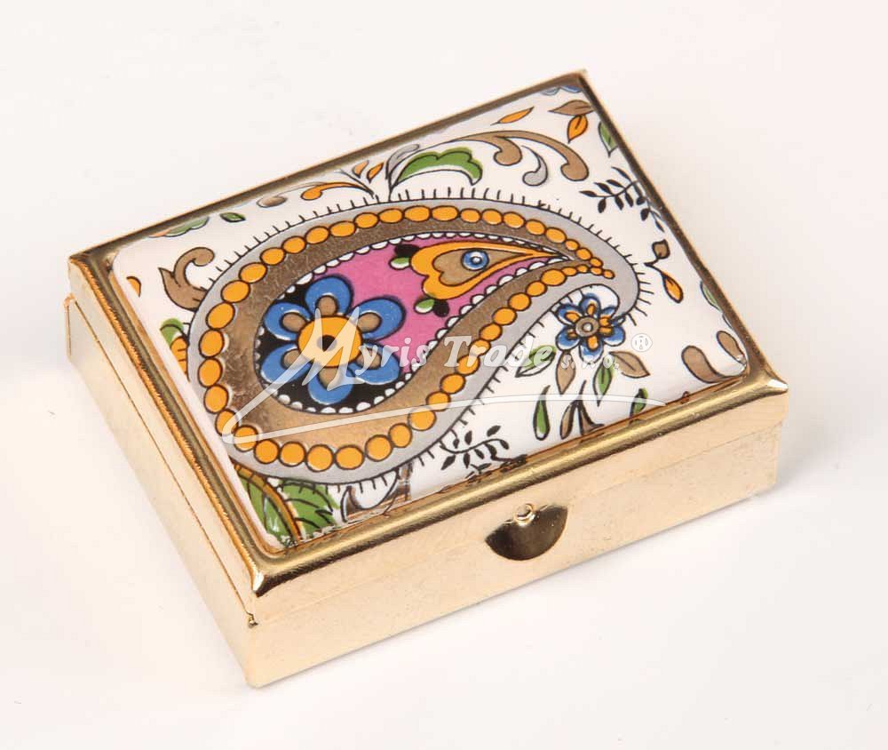 klasická obdélníková lékovka je vyrobena z kovu zlaté barvy s porcelánovým víčkem s kašmírovým vzorem