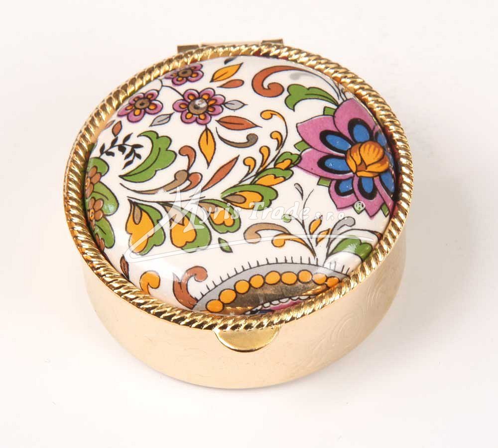 klasická obdélníková lékovka je vyrobena z kovu zlaté barvy s porcelánovým víčkem s kašmírovým vzorem