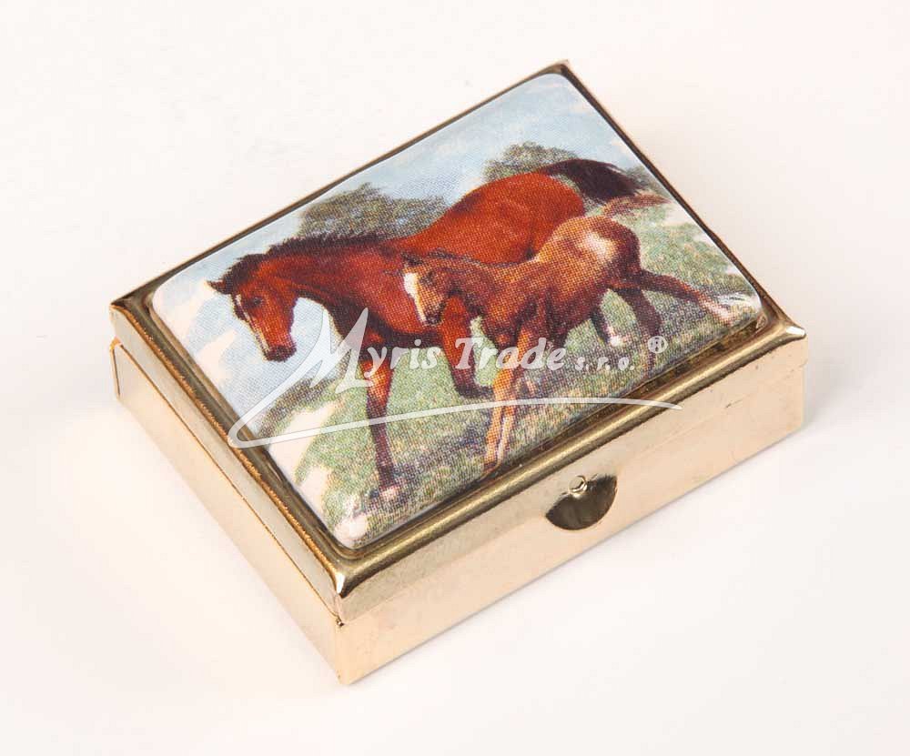klasická obdélníková lékovka je vyrobena z kovu zlaté barvy s porcelánovým víčkem s motivem koňů