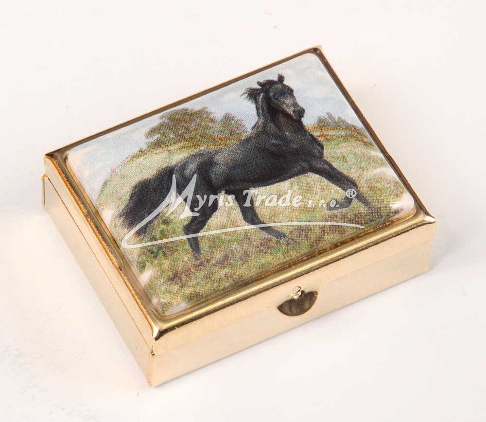 klasická obdélníková lékovka je vyrobena z kovu zlaté barvy s porcelánovým víčkem s motivem koňů